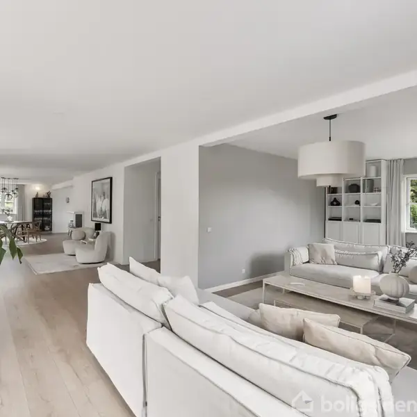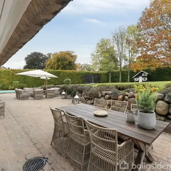 Du møder her en stråtækt ejendom, der forener klassisk idyl med moderne komfort. Her bor du højt placeret med et betagende kig ud over området og de nærliggende hestefolde – et udsyn, der indrammer det fredelige og idylliske liv på landet, blot 20 minutter fra indre København.Ejendommen fra 1999 fremstår med et tidløst udtryk og en harmonisk planløsning, hvor 306 kvadratmeter fordeler sig på tre etager. I stueplan byder huset på et lyst og åbent opholdsrum, hvor køkken, spisestue og stue smelter