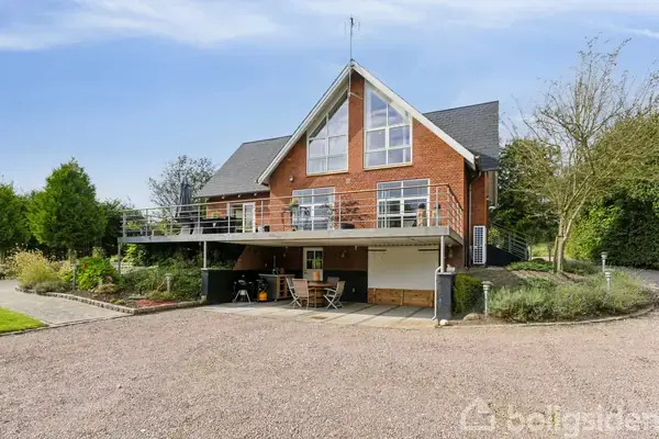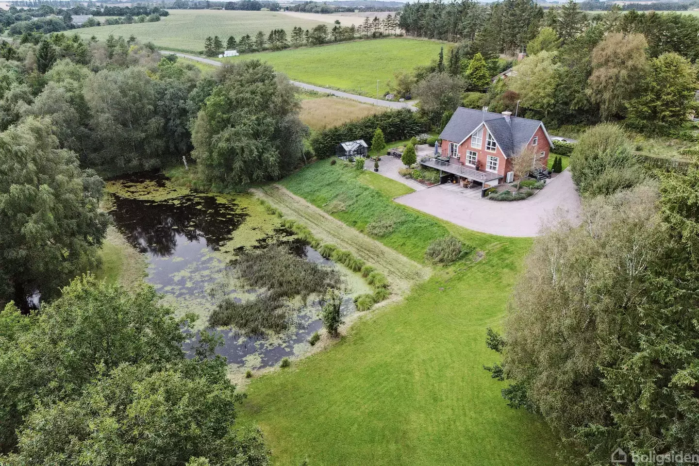 På en naturrig grund på ikke mindre end 2,5 hektar ligger denne fortrinlige villa. Liebhaverejendommen byder på en formidabel udsigt til egen sø og grønne trækroner, og den velkomponerede murermestervilla toner frem med et væld af detaljer. Beliggenheden i den lille, hyggelige landsby Guldbæk er der heller ikke en finger at sætte på. Murermestervillaen blev bygget i røde sten i 1954. Æstetikken er enkel og gennemført ude såvel som inde, og i stueplan centrerer hjemmet sig omkring de markante op