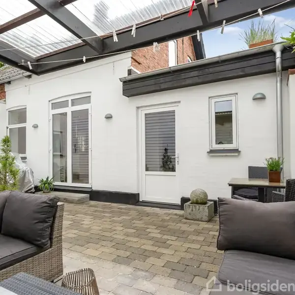 Når du flytter ind i denne rødstensvilla på Gellerupvej i Varde, kommer du til at bo tæt på flot natur, station, skole og idrætsfaciliteter samt Vardes hyggelige midtby. Villaen er smagfuldt moderniseret og byder på en delvist lukket gårdhave og en stor træterrasse. Ejendommen præsenterer sig med en velholdt rødstensfacade, flerfagsvinduer og et mørkt sadeltag med kviste. Indvendigt byder den på en sammenhængende stil, der kombinerer hvide vægge, lyse materialer og moderne interiør med enkelte vægge i flotte grønblå nuancer og fritliggende, mørke bjælker på førstesalen. Stueplan byder på to stuer en suite, køkken-alrum med køkkenhalvø samt badeværelse og bryggers. Førstesalen er en skøn privat afdeling med tre gode værelser med adgang fra en lys repos, hvor der sagtens kan indrettes en lille hjemmearbejdsplads. Der er spots i næsten alle rum også på 1. salen - og der er etableret højtalere i loftet både i køkken og badeværelse. Om sommeren er det nærmest som at have flere ekstra opholdsrum til afslapning, hygge og gæstebud. Langt to af husets facader er der en lukket flisebelagt gårdhave med overdækning i den ene ende, og langs de to andre er der et terrassedæk i træ. Det betyder altså, at man altid kan finde både læ, sol og skygge, og der er også mulighed for at tørre tøj udendørs året rundt på den overdækkede terrasse. Huset ligger i det sydlige Varde, tæt på åen, Skansen og bymidten. Lykkegårdsskolen ligger 900 meter fra hoveddøren, og 350 meter herfra kan du købe ind i Løvbjerg. Her får du kort sagt en flot, indflytningsklar bolig med dejlige udearealer centralt i Varde. Kontakt EDC Varde i dag for en fremvisning.