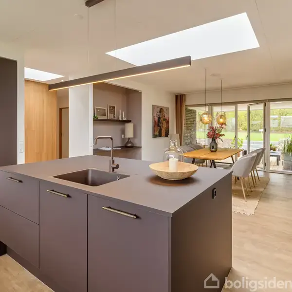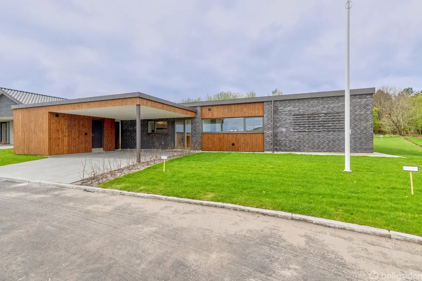 Nyopført og flot villa i bedste kvalitet og retro-stil. Fremstår moderne i sit udtryk og indflytningsklar - beliggende på 1.052 m² grund med have direkte op til skov/plantage. Villaen er på 164 m² med enkel, moderne arkitektur og en velplaceret carport ved indgangen. På en grund på 1.052 m² tilbyder huset et stærkt førsteindtryk med mørke tegl, varme træpaneler og en overdækket indkørsel, der beskytter bilen og giver direkte adgang til entréen. Facaden signalerer lav vedligeholdelse og en ensart
