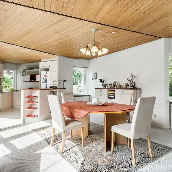 Åbent hus med tilmeldingskrav 2/2 - klik på billede - Særdeles spændende og utraditionel 12-kantet villa med boligareal på 170 m2. Villaen ligger centralt beliggende i No og med kort afstand til Ringkøbing by, blandt andet via den nyanlagte cykelsti. Som noget helt unikt har villaen en helt lukket solgård, hvor der kan nydes mange gode timer. Der er adgang til solgården fra såvel stue og alrum, som værelsesafdelingen. Man overraskes over de store lyse rum i villaen, som er indrettet med en værelsesafdeling og en afdeling med stue og køkken/alrum. Det lyse HTH køkken ligger i åben forbindelse med spisestue og skaber et stort køkken/alrum, hvorfra der naturligvis er adgang til solgården. Den store stue ligger i forlængelse af spisestuen og man forbløffes over de store vinduespartiers lysindfald i rummet, som nærmest smelter sammen med solgården. Der er i værelsesafdelingen et kontor og to værelser, hvoraf det ene let opdeles i to. I No finder man naturligvsi No Sognehus, som er det centrale omdrejningspunkt for det sociale liv i No, og No Børnehus har såvel vuggestue som børnehave.