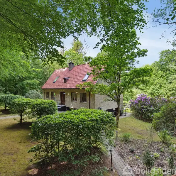 For enden af en lukket vej i naturskønne Rindsholm ligger denne charmerende ejendom omgivet af skov, fuglesang og åløb. Det gule hus fra 1939 fremstår velholdt og indbydende med en klassisk gulstensfacade, nyt tegltag og nyrenoveret overetage fra 2020/2021 – alt udført med respekt for husets oprindelige stil. Huset ligger som et lille åndehul i skoven med blomstrende rhododendron og blødt lys filtreret gennem trækronerne.