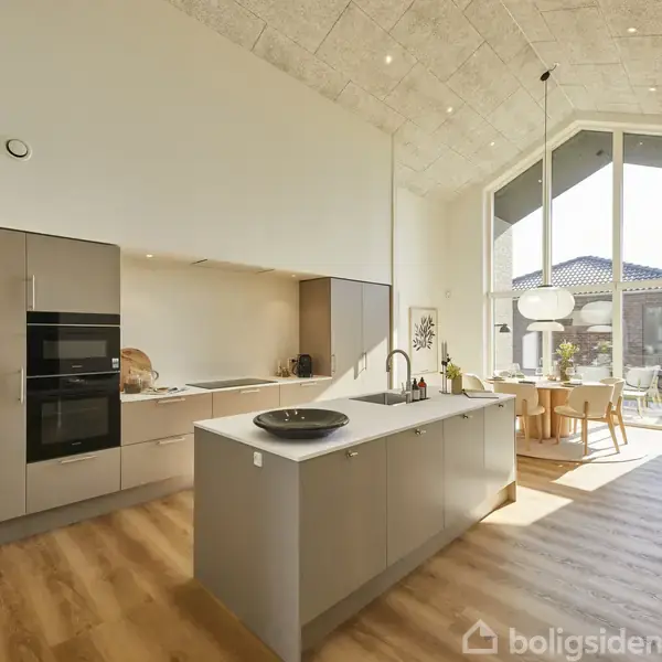 Velkommen til et længehus på 170 m² hvor rummelighed og god stil går hånd i hånd. Når du ankommer til huset på Gøgeurtvej 8 mødes du i første omgang af et imponerende syn. Den overdækkede indgang går helt til kip, og allerede her sættes forventningerne op. Heldigvis bliver samme forventninger mødt, så snart du træder ind i huset. Via entréen kommer du nemlig direkte ind i husets store leverum: Køkken/alrum med åbning til stuen. Her fortsætter de knap 5 meter til loftet med at imponere, og de und