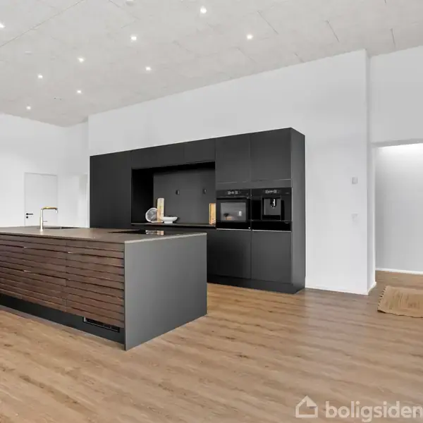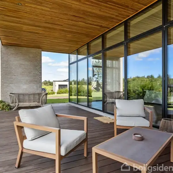 Denne moderne funkisvilla på Golfhaven 12 i Højene er opført i 2021 og rummer hele 214 m² bolig, der er gennemtænkt ned til mindste detalje. Ejendommen er placeret på en 1.109 m² stor grund i et attraktivt nybyggerkvarter, hvor boligerne skyder op side om side, og hvor nabolaget emmer af ro og tryghed. Her kan børnene frit cykle, lege og færdes sikkert, mens de voksne kan nyde områdets mange muligheder for golf, mountainbike, løb eller gåture i den nærliggende skov. Skole og indkøb ligger blot få hundrede meter fra ejendommen, hvilket gør hverdagen nem og overskuelig. Indenfor bydes man velkommen i en lys entré, som leder videre til tre rummelige værelser og et badeværelse. Husets hjerte er uden tvivl det imponerende køkken/alrum, hvor loftshøjden på hele 3,37 meter skaber en helt særlig atmosfære. Her er der god plads til både hverdagens familieliv og hyggelige middage med gæster. Alrummet rummer også en integreret alkove med smart opbevaringsløsning samt et praktisk viktualierum. Fra alrummet åbner en stor skydedør ud til boligens overdækkede terrasse, som bliver et naturligt ekstra opholdsrum i de varme måneder. Her kan man sidde helt uforstyrret og nyde solen fra tidlig middag og langt ud på aftenen, hvad enten det er til afslapning, en hyggelig grillmiddag eller samvær med familie og venner. Terrassen skaber en glidende overgang mellem inde- og udeliv og gør det nemt at forlænge sommerdagene i komfortable rammer. Fra alrummet er der ligeledes adgang til forældreafdelingen, som er indrettet med walk-in closet, soveværelse og et luksuriøst badeværelse. Her finder man både en rummelig bruseniche og et elegant fritstående stenbadekar, der giver rummet en eksklusiv spa-følelse. Begge badeværelser er udstyret med Vola-armaturer og store ovenlysvinduer med motor og regnsensor, hvilket kombinerer høj kvalitet med smukt lysindfald året rundt. Til boligen hører desuden et funktionelt bryggers med vaskefaciliteter og rigelig plads til opbevaring. Herfra er der direkte adgang til carporten på 50 m², der er smukt beklædt med cedertræ, og som samtidig rummer et 10 m² stort udhus. Komforten er i top med gulvvarme i hele huset – dog med undtagelse af viktualierummet – og derudover er boligen udstyret med både BWT-anlæg og genveksanlæg, som sikrer et sundt og behageligt indeklima året rundt. Køkken, bryggers og badeværelser er indrettet med stilrene elementer fra HTH, hvilket understøtter boligens stringente arkitektoniske linjer og moderne udtryk. Her får man en indflytningsklar bolig, hvor kvalitet, funktionalitet og beliggenhed går op i en højere enhed – og hvor den overdækkede terrasse sætter rammen for mange gode stunder året rundt.