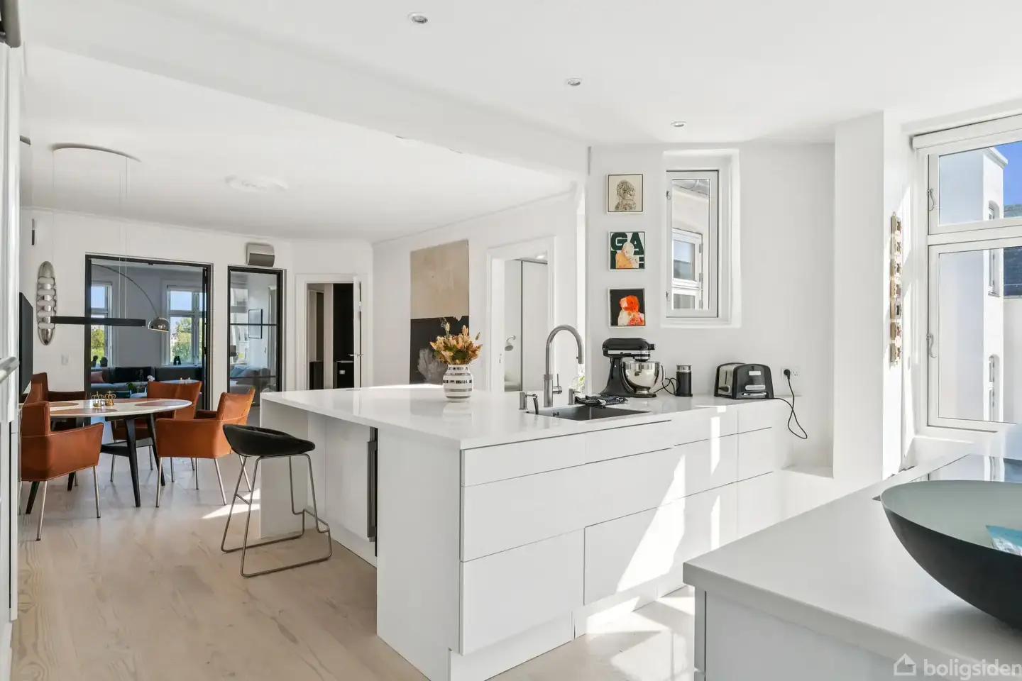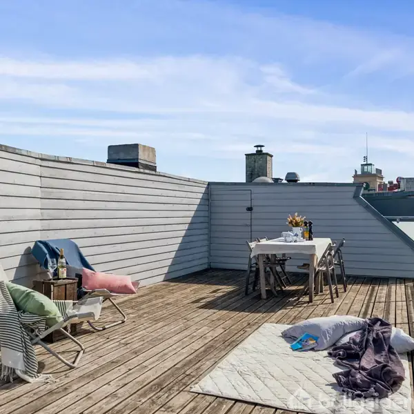 Gennem renoveret Penthouse med eksklusiv tagterrasse Velkommen til en vaskeægte københavnerperle! Lige overfor Kongens Have – hvor fuglene kvidrer, og unge går hånd i hånd – finder du denne unikke lejlighed med en billedskøn udsigt til Rosenborg Slot. Lejligheden blev totalrenoveret i 2017 med blandt andet smukke Dinesen-gulve, moderne køkken fra Aubo og et stilfuldt badeværelse. Alt fremstår indflytningsklart og gennemført. Prikken over i’et? Den store, solrige tagterrasse, som du nemt tilg