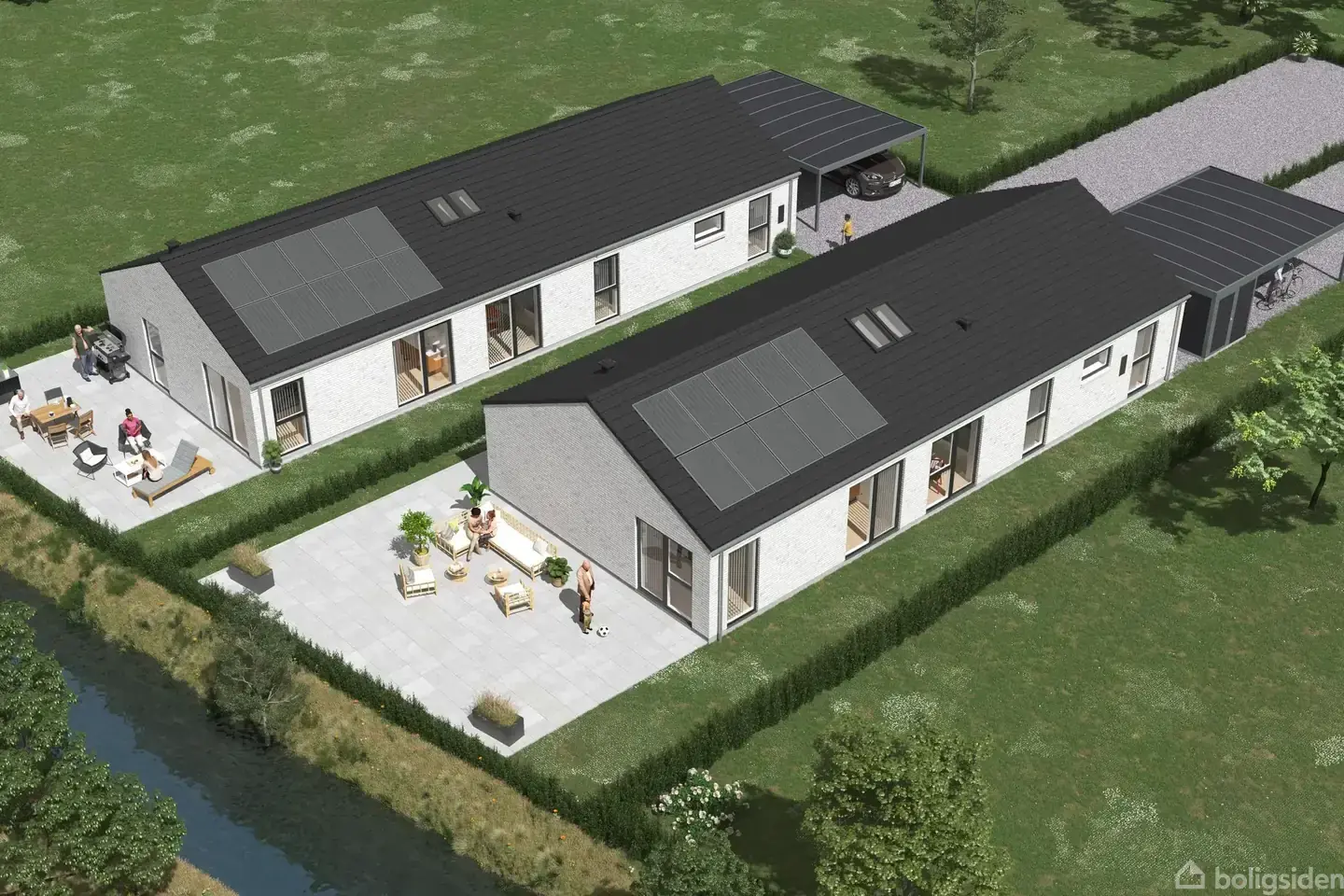 To moderne tvillingehuse på hhv. 161 og 171 m² opføres nu på Greve Strandvej 134 – et kvalitetsbyggeri fra Eurodan-Huse med fokus på høj materialestandard, lavt energiforbrug og en attraktiv strandnær beliggenhed. Husene placeres tilbagetrukket fra vejen på en rolig grund, hvor en lille bæk løber langs baghaven og tilfører området en sjælden naturnær stemning. Begge huse leveres nøglefærdige med carport, anlagt have, flisebelagte terrasser og moderne arkitektur, inspireret af de lyse nordiske materialer, som også fremgår af prospektet. Ved køb inden byggestart vil der desuden være mulighed for at få indflydelse på både rumdeling og indvendigt materialevalg, så boligen kan tilpasses individuelle ønsker. Boligerne opføres i lavenergiklasse med solcelleanlæg og moderne varmepumpe, hvilket tilsammen sikrer et markant lavere energiforbrug end traditionelle byggerier. Kombinationen giver en stabil, økonomisk og fremtidssikret drift, hvor solcellerne bidrager med egenproduktion af el, og varmepumpen udnytter energien yderst effektivt året rundt. Samtidig er der gulvvarme i alle rum, hvilket ikke blot optimerer energiforbruget, men også skaber en særlig komfort og jævn varmefordeling i hele boligen. Facaderne udføres i blødstrøgne sten, tagene i sorte betontagsten og vinduerne som 3-lags træ/alu fra Velfac. Indvendigt mødes man af lyse trægulve, gipslofter og en gennemgående modernitet, som skaber et harmonisk og tidløst udtryk. Planløsningen er stort set identisk i de to huse: et stort og åbent køkken/alrum med ovenlys og direkte udgang til terrasse, en sammenhængende opholdsstue med store vinduespartier, fire gode værelser, hvoraf forældreafdelingen har walk-in og eget badeværelse, samt endnu et badeværelse, et rummeligt bryggers og et separat depotrum. Alt er disponeret med fokus på funktionelt flow, gode opbevaringsmuligheder og et naturligt lysindfald. Beliggenheden er en væsentlig kvalitet ved projektet. Fra grunden er der kun få minutters gang til Greve Strand med fine badeforhold året rundt, mens Mosede Havn ligger tæt på og byder på et levende maritimt miljø med spisesteder, ishus og aktiviteter i sommerhalvåret. Herfra er der kort afstand til Greve Midtby Center, Greve Station, skoler, gymnasium og idrætsfaciliteter – og motorvejen nås på få minutter, hvilket sikrer en smidig forbindelse til både København og Køge. Kombinationen af strandliv, moderne komfort og et gennemført energirigtigt byggeri gør disse to huse til en sjælden mulighed for dem, der ønsker at flytte direkte ind i kvalitetsrammer i et af Greves mest eftertragtede områder.