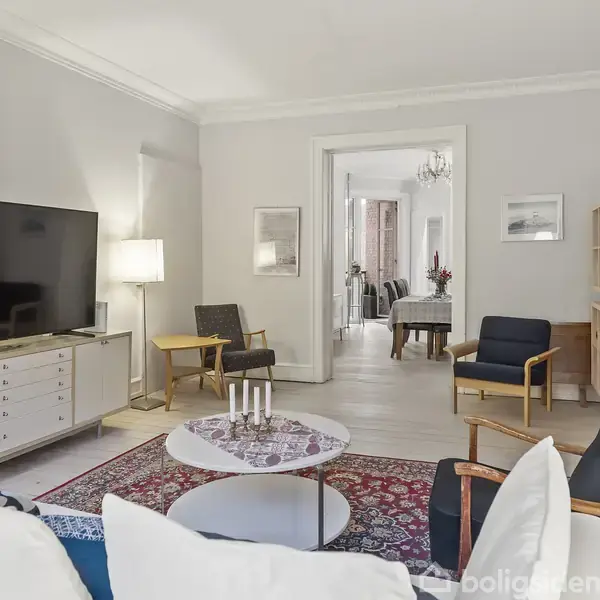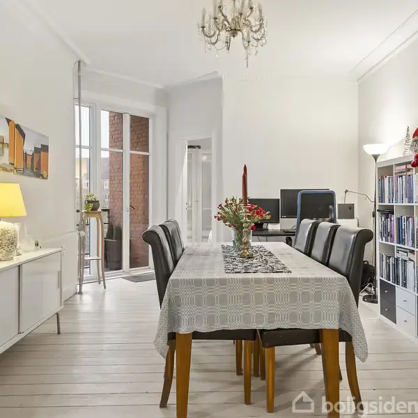 LEJLIGHED: Træd ind i denne charmerende og sjældent udbudte herskabslejlighed, hvor klassiske detaljer og generøse rum udfolder sig fra det øjeblik du træder indenfor. Her får du højt til loftet, flotte fyldningsdøre, elegant stuk og store vinduespartier, der lader lyset strømme ind og skaber en indbydende atmosfære gennem hele boligen. Lejligheden byder velkommen i en rummelig fordelingsentré med god plads til overtøj og sko. Det første soveværelse er lyst og rummeligt med plads til dobbeltseng