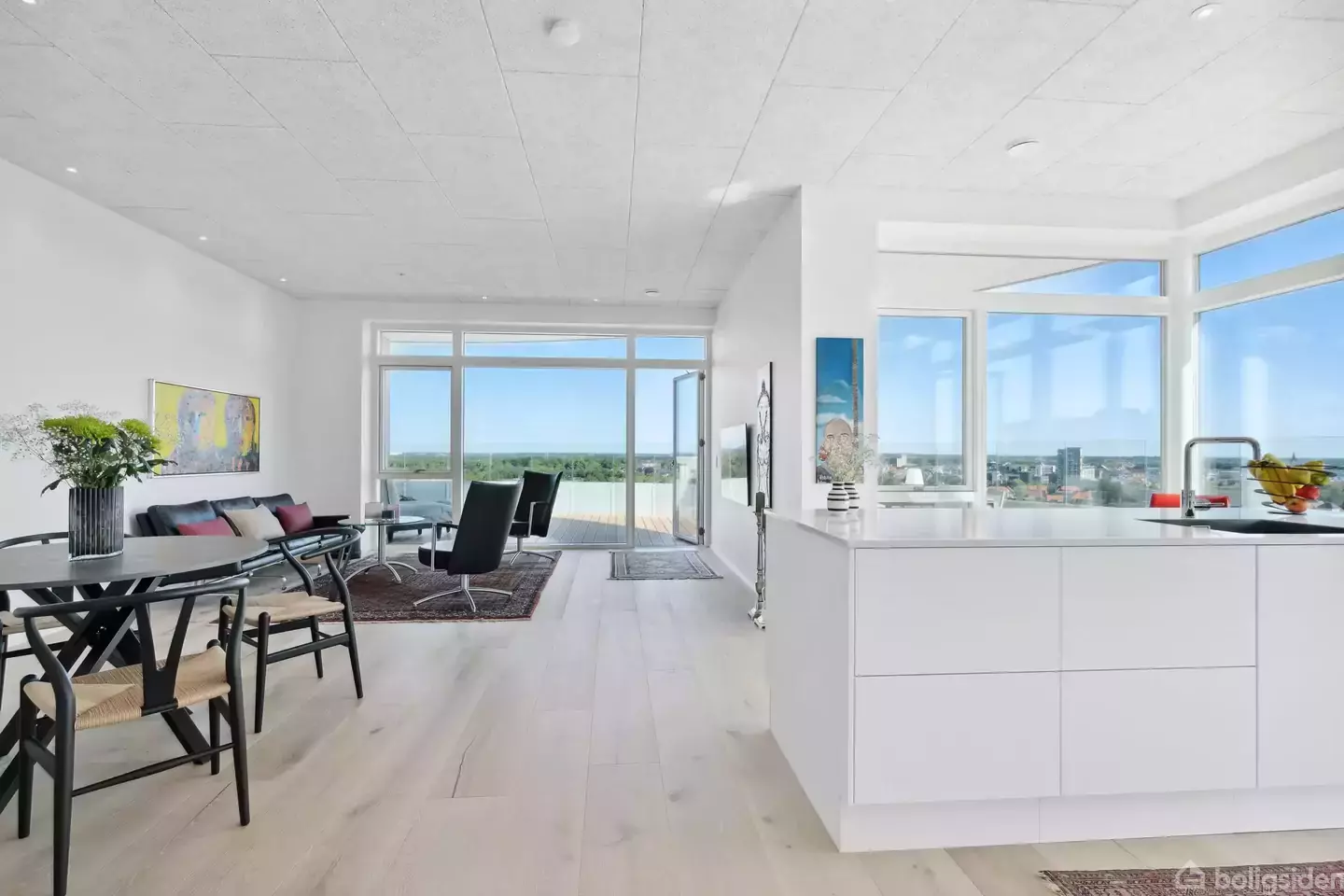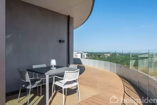 Denne lejlighed er en perle med sin enestående udsigt og beliggenhed på 12. sal i en nyopført bygning. Med en rummelig terrasse på hele 60 kvadratmeter får du masser af plads til at nyde panoramaudsigten over byen eller bare slappe af udendørs. Lejligheden er moderne og stilfuldt indrettet med høj kvalitet.. Den åbne planløsning giver en følelse af rummelighed og lader naturligt lys strømme ind i rummene. Stuen er lys og inviterende med store vinduer, der giver mulighed for at nyde den fantasti