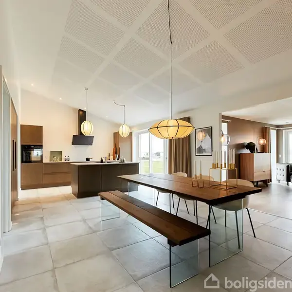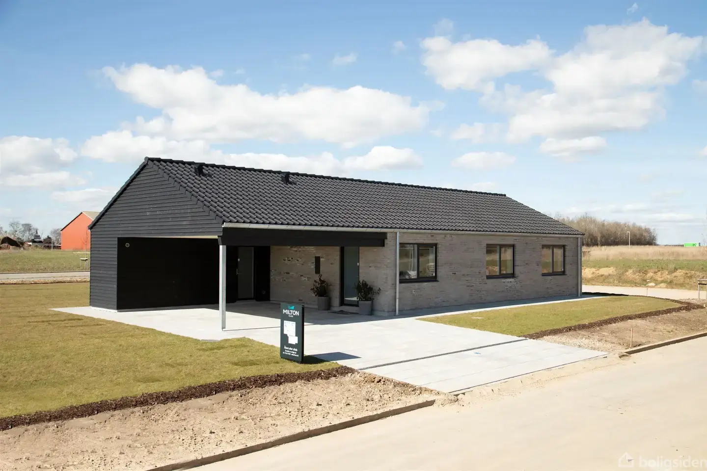 Her får du muligheden for at blive den allerførste beboer i et gennemført og moderne Milton-vinkelhus på 150 m² - projekthuset opføres i kvalitetsmaterialer og med en gennemtænkt planløsning, der passer perfekt til den moderne familie. Arkitektur, lys og rene linjer Villaen opføres som et klassisk og tidløst vinkelhus med sort betontagsten, murede facader og elegante arkitekt-tagrender i stål. Udtrykket er stilrent og nutidigt, og huset er uden udhæng, hvilket giver et skarpt og moderne look. De store 3-lags træ/alu-vinduer sikrer et flot lysindfald i hele boligen og understreger den lyse og indbydende atmosfære. I badeværelserne er der satin-glas, som skaber privatliv uden at gå på kompromis med lyset. Hjemmets hjerte - køkken/alrum og stue i ét Boligens naturlige samlingspunkt er det store køkken/alrum på over 30 m² med ensidig loftshældning og akustikloft, som både giver rumfornemmelse og en behagelig lyd. Her er der god plads til både hverdag og gæster - og direkte udgang til den overdækkede terrasse. Køkkenet leveres med inventar fra HTH og med god mulighed for at sætte sit personlige præg inden opførelse. Der er afsat et generøst beløb til både inventar og hårde hvidevarer, så kvalitet og funktionalitet går hånd i hånd. Stuen ligger i åben forbindelse med alrummet og får et flot akustikloft, der skaber ro og komfort i rummet. Herfra er der ligeledes udgang til haven. Velindrettet planløsning med separat forældreafdeling Boligen rummer tre gode værelser samt en oplagt forældreafdeling med soveværelse og walk-in-closet. Der er to badeværelser, begge med væghængte toiletter, bruseniche med linjeafløb og moderne armaturer. Planløsningen giver en naturlig opdeling mellem børne- og voksenafdeling, samtidig med at fællesområderne samler familien centralt i huset. Bryggerset er praktisk placeret med egen indgang og god opbevaringsplads - ideelt til hverdagens logistik. Komfort, energi og indeklima Huset opføres efter gældende BR18-krav og får jordvarmeanlæg, gulvvarme med trådløs styring samt ventilationsanlæg med varmegenvinding. Det giver både lavt energiforbrug og et sundt og behageligt indeklima året rundt. Der er klinker i køkken/alrum, bryggers og badeværelser samt flotte trægulve i opholdsrum og værelser, hvilket skaber en harmonisk og moderne helhed. Carport, redskabsrum og overdækket terrasse Til boligen hører en integreret carport på 48 m² med tilhørende redskabsrum på 12 m² - perfekt til både bil, cykler og opbevaring. Derudover får du en overdækket terrasse på 9 m², så udelivet kan nydes i både sol og let regn. Beliggenheden - Guldbækhaven Boligen opføres i det attraktive område Guldbækhaven - et nyere og roligt kvarter med naturen tæt på. Her bor du med kort afstand til stisystemer, grønne områder og det hyggelige lokalmiljø, samtidig med at Støvrings mange faciliteter, indkøbsmuligheder, skole og fritidsaktiviteter er inden for overskuelig rækkevidde. Her får du et helt nyt hjem, hvor alt er gennemtænkt fra start - moderne arkitektur, energirigtig komfort og en planløsning, der fungerer i hverdagen.
