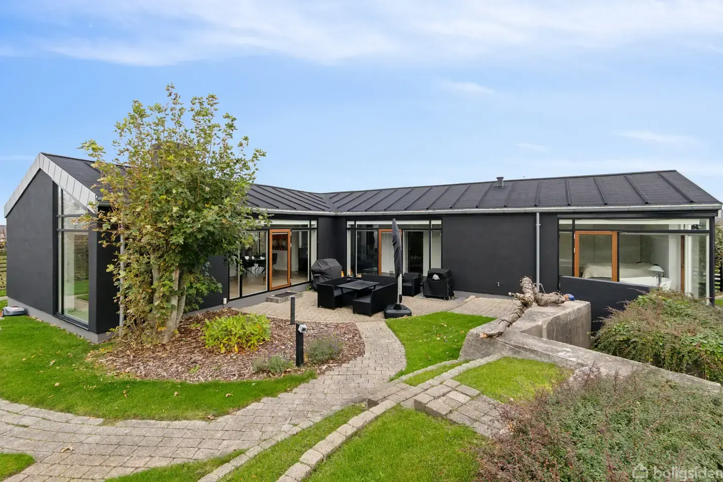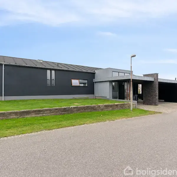 Eksklusiv liebhaver-villa på ét plan med 166 m² bolig og 86 m² velindrettet kælder på en privat grund på 812 m². Opført i 1970 med stram, tidløs arkitektur og en markant mørk facade; carport og overdækket indgang understreger det solide førstehåndsindtryk. Sælger fremhæver lysindfaldet i hele huset, og store glaspartier fra facade til terrasse lader lyset og haveoplevelser flyde ind, hvilket skaber et elegant samspil mellem inde og ude. Indvendigt mødes man af et åbent, sammenhængende opholdsrum