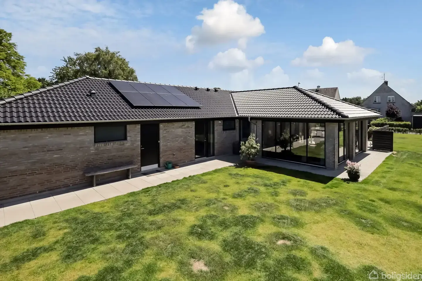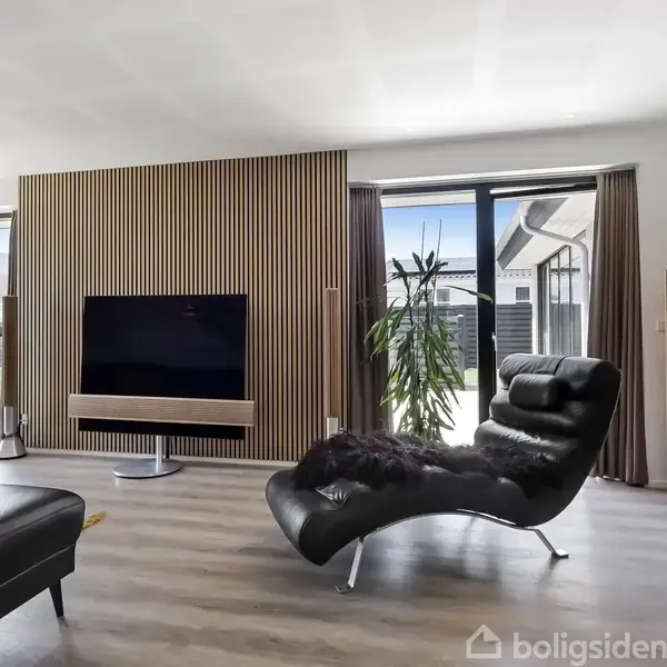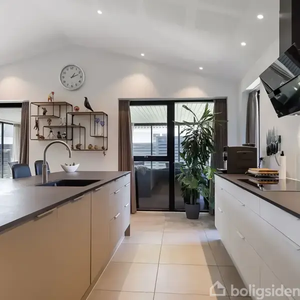 Velkommen til denne moderne og velindrettede villa, opført i 2022, hvor funktionalitet og æstetik går op i en højere enhed Her får I et hus i ét plan – helt uden dørtrin – som byder på gennemtænkte løsninger og en indretning, der passer perfekt til børnefamilien, eller bare til jer, der drømmer om et hjem med rigtig god plads. Indflytningsklar kvalitetsvilla i ét plan – med dobbeltgarage, og skøn sydvestvendt terrasse. Er opført med lyse, pudsede facader med kig til murstensdetaljer, hvilket skaber et stilrent og indbydende udtryk. Hele vejen rundt om huset er der anlagt fliser, og ved indkørslen er der ekstra god plads til parkering, foruden den store, integrerede dobbeltgarage med to elektriske porte og direkte adgang til boligen. Carporten har gulvvarme. Villaens lys og varme kan fjernstyres via en app på telefonen da installationerne er koblet op via SG Smart systemet. Indenfor bydes I velkommen i en lys entré med god skabsplads samt plads til både vaskemaskine og tørretumbler. Her er der valgt en flot lyddæmpende vægbeklædning med listeeffekt, som tilfører rummet varme og ro og skaber atmosfære. De gennemgående, grå klinker i entré, køkken og depot samt på badeværelserne giver et roligt og sammenhængende udtryk, mens værelserne og stuen har trægulve. Husets naturlige samlingspunkt er det store, åbne køkken/alrum, hvor der er god plads til både madlavning, samvær og hyggelige stunder. Køkkenet er moderne indrettet med blandt andet en stor kogeø med siddeplads ved to barstole. Her er der desuden indbygget et vinkøleskab – perfekt til at have drikkevarerne lige ved hånden under madlavningen eller til gæster. En praktisk Quooker sikrer hurtig kaffe til uventede gæster. Der er ingen overskabe, hvilket skaber en let og luftig fornemmelse og understreger det enkle, rolige udtryk. Højskabene, som rummer ovn og ekstra opbevaring, er elegant integreret i væggen, så køkkenet fremstår strømlinet og overskueligt. Loftet er ført til kip og giver rummet en imponerende rumfornemmelse og masser af karakter.