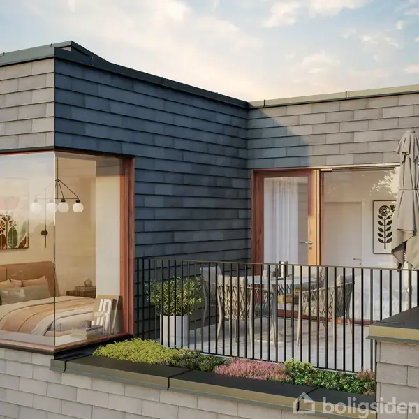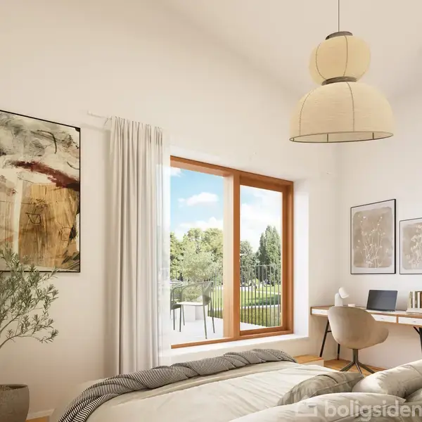 Stor bolig med lys, luft og fleksibilitet Boligtype F, som ligger direkte ud til Nattergaleengen og alt det grønne, er blandt de mest rummelige i Hannebjerglund – en bolig med generøse kvadratmeter at udfolde hverdagen på. Her møder man arkitektoniske kvaliteter som mahognivinduer, Junckers egetræsgulve og facader i tegl, kombineret med trædetaljer og grønne sedumtage, der binder bebyggelsen smukt sammen med naturen.I stueplan byder entréen velkommen med garderobeskab i egetræ fra Køkkensnedker