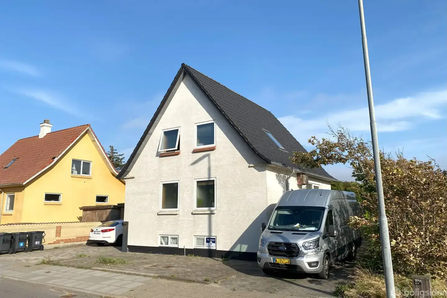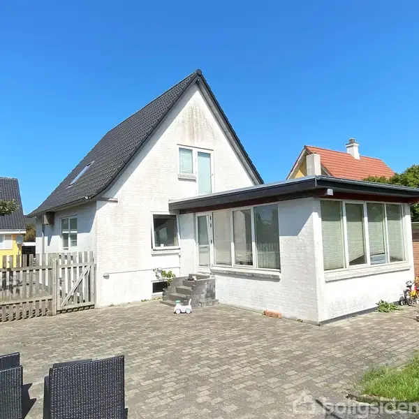 Centralt beliggende villa med udnyttet 1. sal og et samlet boligareal på ialt 160 kvm. hvortil kommer 72 kvm. kælder. Endvidere er der 44 kvm. carport med stort redskabs- og værkstedsrum. Beliggende midt i Hirshals by på en 549 kvm. stor grund med store flisebelagte terrasser. Kort afstand til skole, gå-gade, strand, havn o.s.v. Villaen, der er opført i 1952, har sort tegltag, overvejende plast-termovinduer, ludbehandlede trælofter og opvarmes ved fjernvarme. Indeholder: entré med trin til stueplan og kælderplan, cirka 70 kvm. stort køkken/alrum/opholdsstue med udgang til terrasse og have, depotrum, lyst badeværelse med bruseniche, klinkegulv og gulvvarme. 1. sal indeholder: 2 værelser, stort soveværelse med skabsvæg og skydelåger, lille toilet. Kælder: vaskerum/grovkøkken med klinkegulv, stort disponibelt rum, installations-/værkstedsrum, baderum med klinkegulv, kar og håndbruser.
