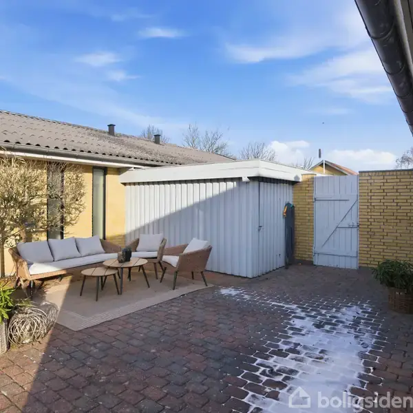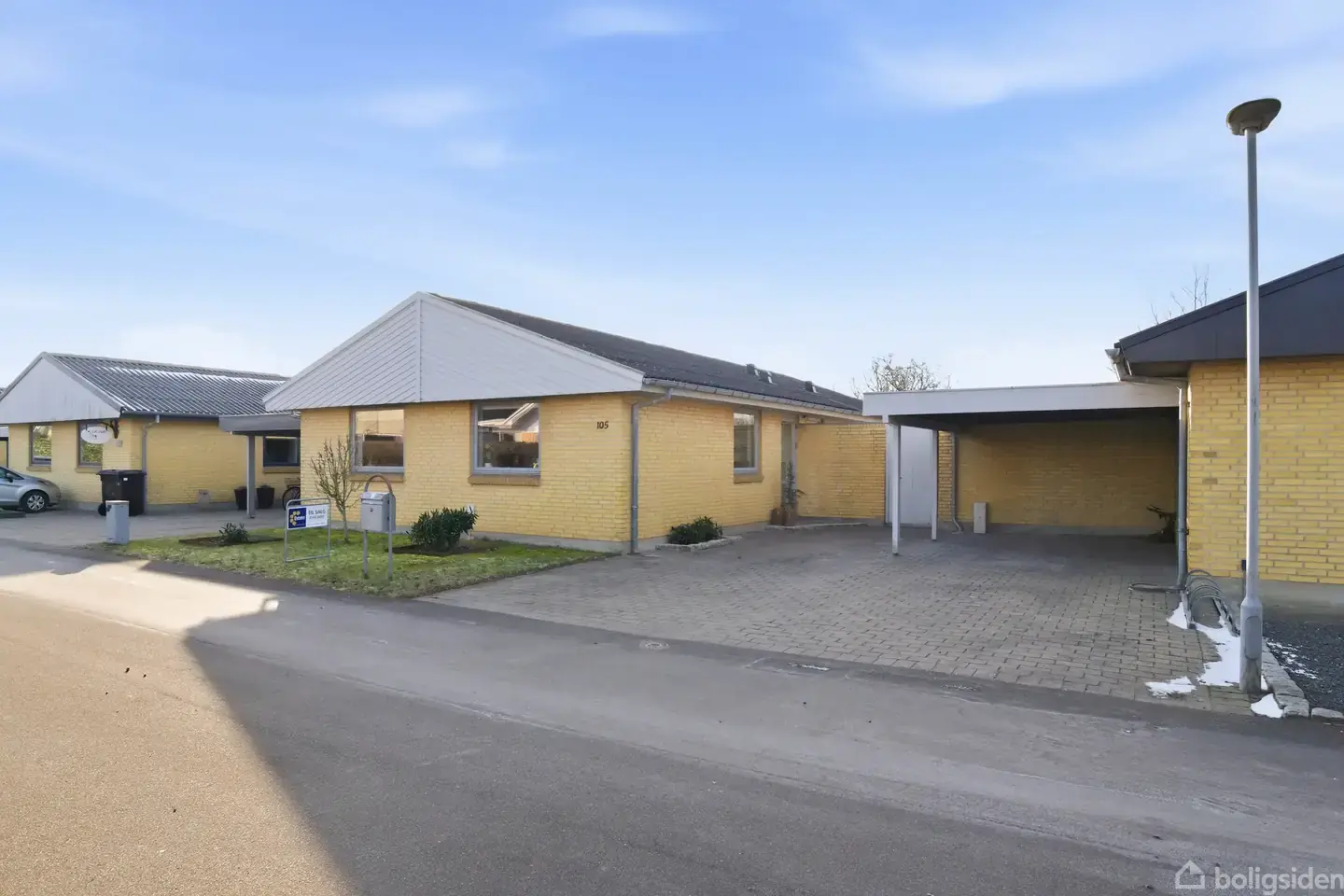 Ved enden af lukket stikvej i Ellebæk finder du dette velindrettede rækkehus i ét plan.Beliggenheden er tæt på skoler, børnepasning, uddannelsesinstitutioner og indkøb. Endvidere byder området på stort udbygget stisystem og nem adgang til motorvejen uden af være generet af den. Rækkehuset er indrettet med entré og fordelingsgang til gæstetoilet, 2 børneværelser, soveværelse og badeværelse med brus. Husets anden indgang er bryggers, som giver adgang til dejligt køkken-alrum med flot køkken og i å