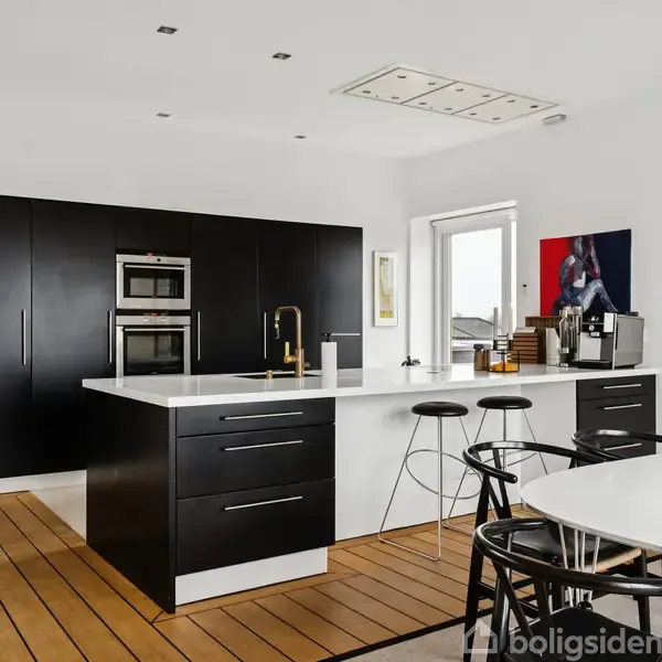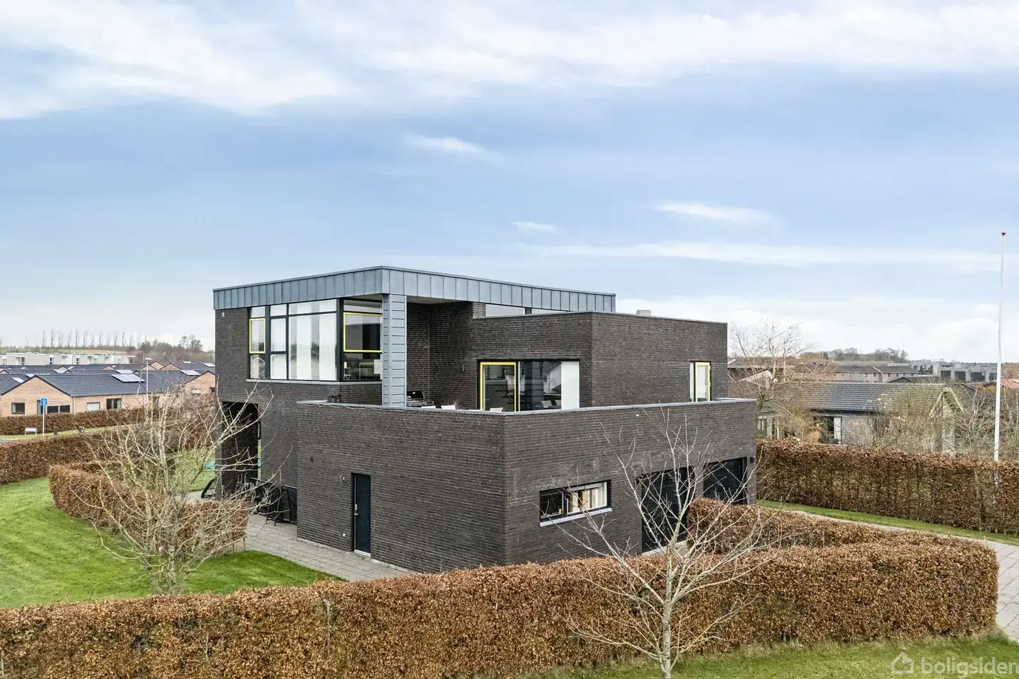 Velkommen til Solbjerg, hvor moderne arkitektur, gennemtænkt planløsning og en særdeles attraktiv beliggenhed går op i en helstøbt helhed. Facadens mørke murværk står skarpt mod naturens grønne rammer, og de store vinduespartier trækker lyset og udsigten helt med ind. Fra første øjekast mærker man følelsen af luft, lys og arkitektonisk kant.Den mørke tegl får smukt modspil af zinkdetaljer og mørke rammer, mens udvalgte gule vinduer tilfører karakter og vidner om, at intet her er tilfældigt. Alt