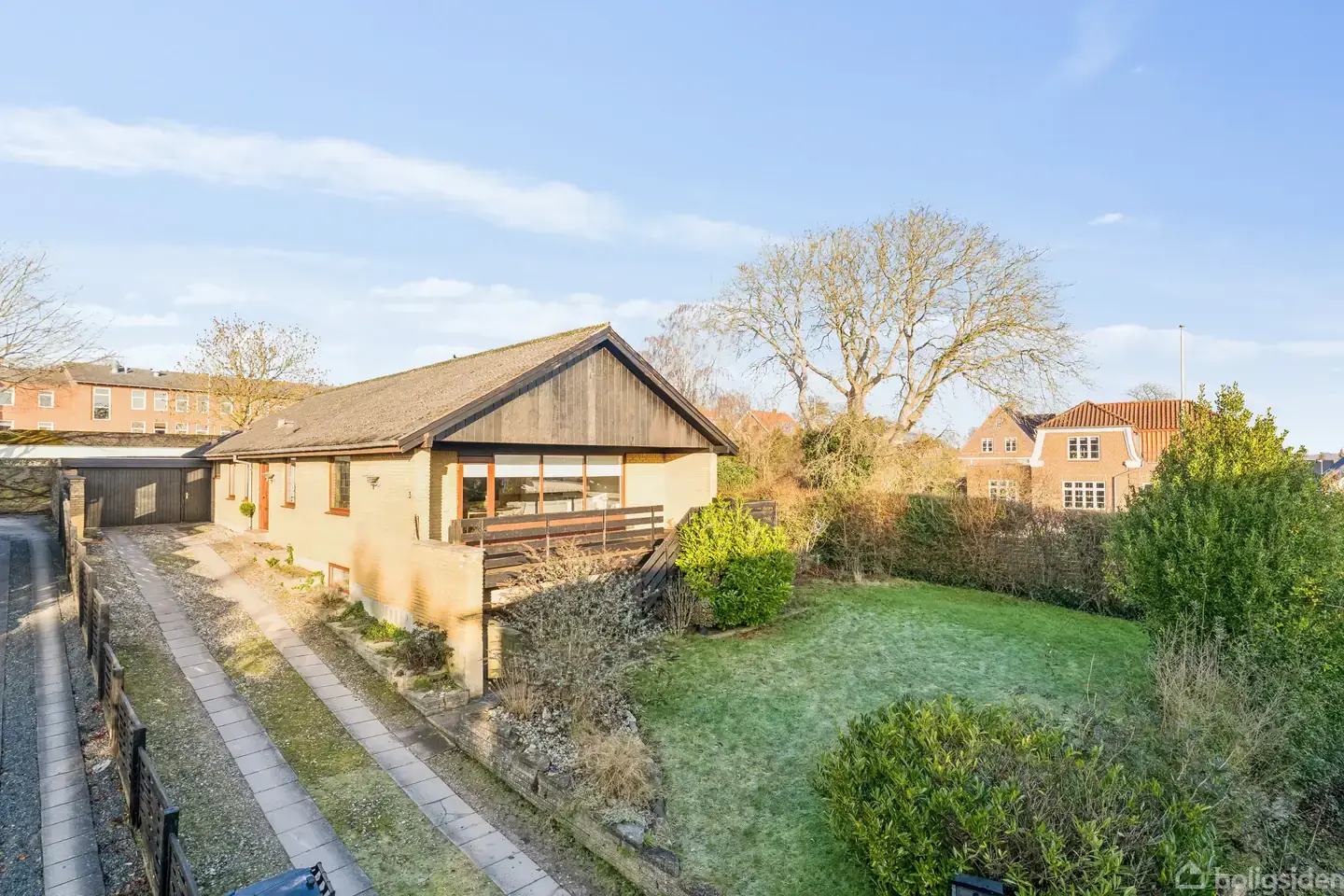 I flytter til et område præget af fred og ro. Både børnenes skole og en integreret institution nås mindre end ti minutters gang væk, ligesom I blot skal transportere indkøbsposerne få hundrede meter mellem hoveddøren og de nærliggende indkøbsmuligheder. Udflugter til fjorden klares desuden med en helt kort cykeltur, mens byens café- og handelsmiljø ligeledes kan lokaliseres på to hjul eller efter ca. fem min bag rattet. Her skal I søge mod en blind vej, hvor et rigtig dejligt hus står klar til