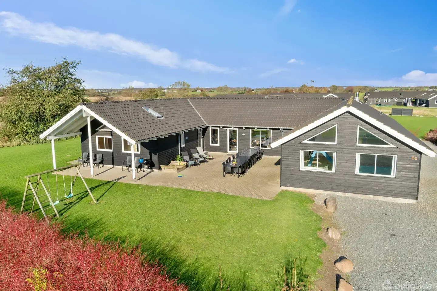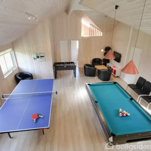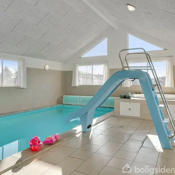 Dette rummelige og velindrettede Skanlux sommerhus på Sydals er skabt til samvær, hygge og oplevelser – et feriehus, hvor både børn og voksne kan finde aktiviteter fra morgen til aften.I husets store poolafdeling er der garanti for sjove timer. Den 20 m2 store pool med romersk trappe indbyder til leg og svømmeture, mens vandrutsjebanen er et sikkert hit for de yngste. Efter en frisk svømmetur kan der nydes en afslappende stund i det store spabad med plads til 4-6 personer, eller varme sig godt i