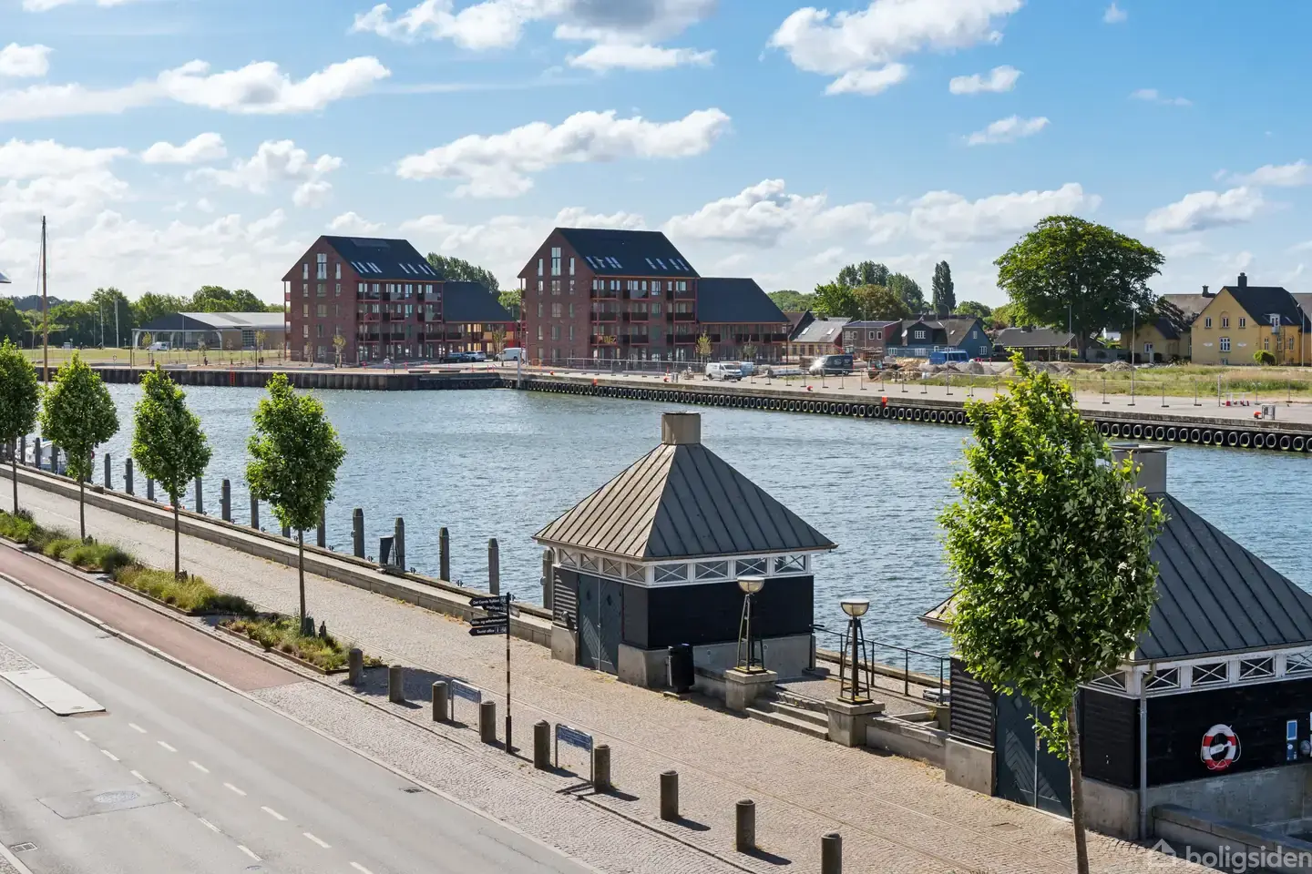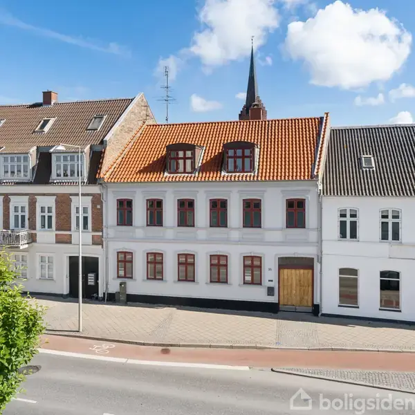I dag er ejendommen en indflytningsklar dobbelthus, hvor der er plads til en stor familie eller mulighed for at drive Bed & Breakfast. I begge tilfælde er beliggenheden lige ved kajkanten og alle byens faciliteter særdeles attraktiv.Et stringent, klassisk udtrykFacaden mod havnen består af tidstypiske detaljer og træk fra opførelsesåret 1910. Omkring vinduerne med letbuet overkant er der dekorative fremhævninger, og tilsvarende er der gjort en indsats ved de relieflignende felter under vinduerne