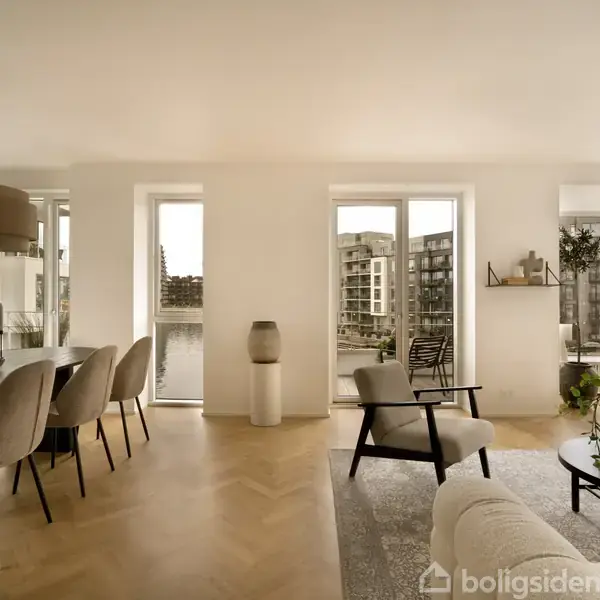 Kom med ind i stuen og sæt dig på den lune radiatorskjuler op til det store hjørnevindue, og så bare - aaahhhh. Det ville være lige her, man ville placere det famøse, røde tæppe, hvor der er kig til kanalen, til havneløbet og til de charmerende husbåde i københavns ældre husbådeforening. Men faktisk er hele denne udsigtslejlighed på Havneholmen en fornøjelse for såvel øjnene som hjertet. I får blandt andet tre altaner, to soveværelser og et helt vidunderligt opholdsrum med udsigt til praktisk ta