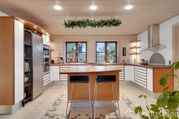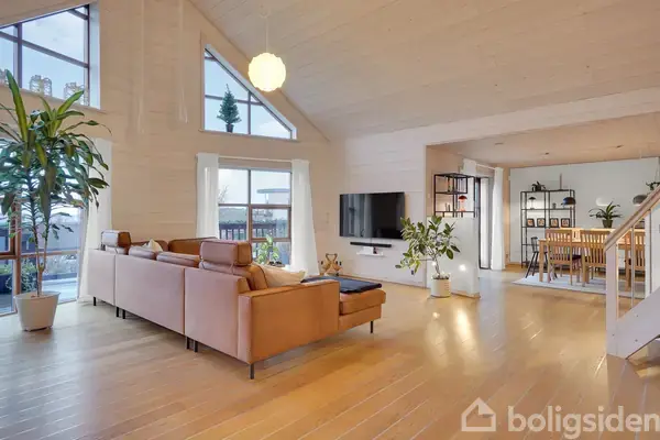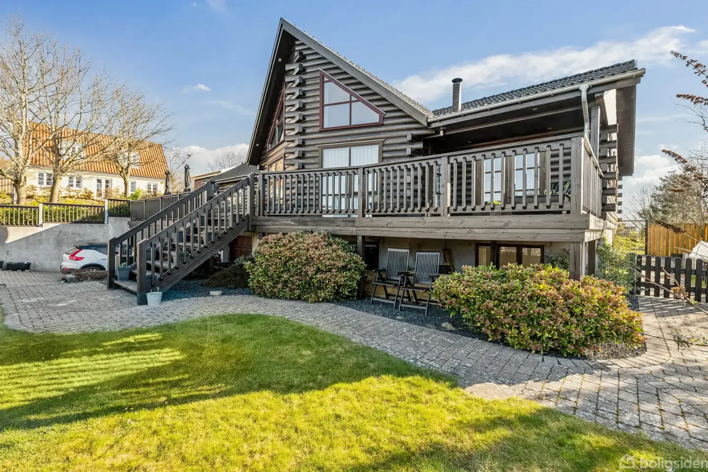 Denne liebhaverbolig i amerikansk bjælkestil fra AmerLink tilbyder alt, hvad den moderne familie kan drømme om – og lidt til. Med sine 406 m2 under samme tag, og en beliggenhed på en attraktiv, tilbagetrukket adresse i Ebeltoft, er det en bolig i særklasse. Og som prikken over i’et kan I nyde havkig fra både stueplan og hems.Villaen skiller sig ud allerede ved første øjekast. Den flotte facade i bjælker rejser sig over en stor, velanlagt gårdsplads. En elegant trappe fører op til husets hævede s
