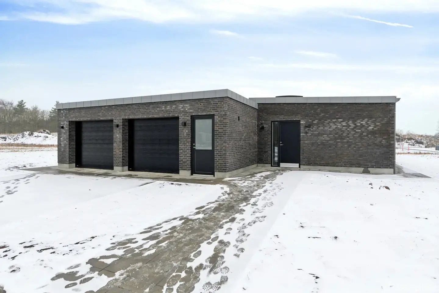 Stor, nyopført etplansvilla med dobbeltgarage Denne nyopførte villa i Brande står nu klar til jer, der søger en topmoderne bolig, hvor der er plads til hele familien. Huset er lige til at flytte ind i, og det byder blandt andet på fire værelser, to badeværelser og to sammenhængende opholdsrum. Ejendommen har tilhørende dobbeltgarage med gulvvarme, og grunden er allerede anlagt med en sydvendt terrasse. Villaen præsenterer sig med en geometrisk arkitektur, der understreges af det flade tag. Sids