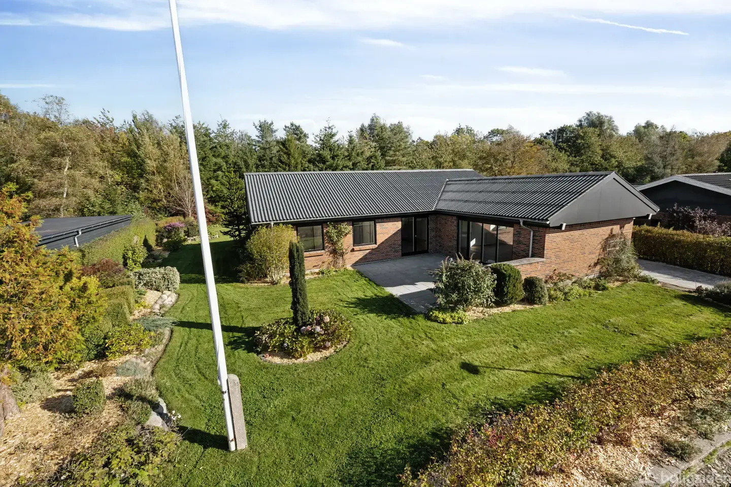 Nu kan I overtage nøglerne til en klassisk rødstensvilla, der så sent som i år er blevet gennemrenoveret og opdateret med øje for detaljen, så I kan flytte direkte ind i et hjem, hvor alt spiller fra dag ét! Det mærkes allerede ved ankomsten: indkørslen med nylagte fliser fører jer op til carporten, og facaden står nymalet og skarp mod himlen. Rundt om huset ligger terrasserne – også med nye fliser – så I kan følge solen fra de første stråler i øst til de gyldne aftentimer i vest. Ydermere byd