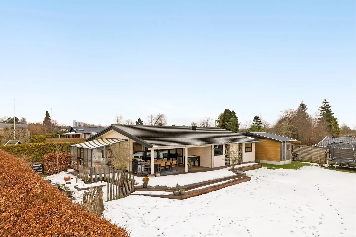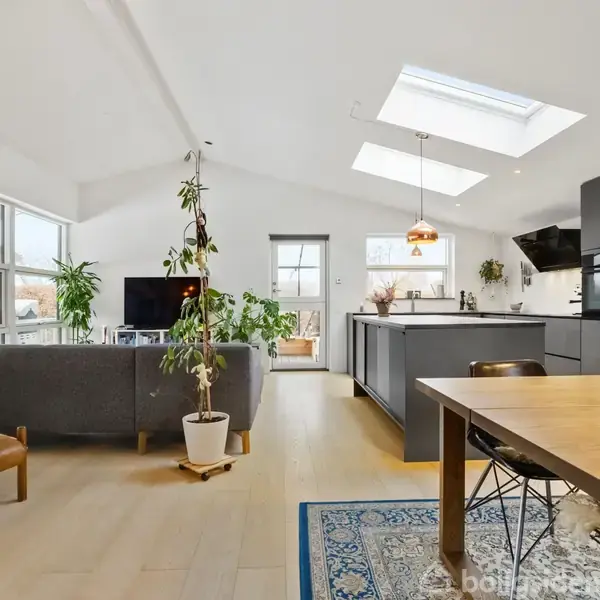 Åbent hus med tilmeldingskrav 1/3 - klik på billede - Drømmer I om et fristed, hvor natur, arkitektur og komfort går op i en højere enhed? Nu udbydes et sjældent og helt unikt kolonihavehus fra 2019 – hele 99 lovlige m² – beliggende på en imponerende 814 m² dobbeltgrund i attraktive Parcelforeningen Godthåb i Skovlunde. Her får I et gennemført og moderne hus med loft til kip og ovenlysvinduer, der lader lyset strømme ind og skaber en helt særlig rumfornemmelse. Husets naturlige samlingspunkt er det åbne køkken/alrum, hvor det stilrene køkken fra KVIK smelter sammen med stuen i ét stort og indbydende leverum. Herfra er der direkte udgang til et fantastisk syd-/østvendt træterrassemiljø, hvor ca. 30 m² er overdækket – perfekt til lange sommeraftener, hyggelige middage og afslapning i al slags vejr. Sæsonen forlænges yderligere med en skøn 12 m² udestue, som skaber en glidende overgang mellem inde og ude. Huset rummer desuden entre, tre gode soveværelser – alle med terrassedøre, så I kan vågne op og træde direkte ud i det fri. Hertil kommer et moderne badeværelse med brus. Komforten er i top med gulvvarme via luft-til-vand-anlæg, genvex-ventilation og BWT-anlæg – løsninger man sjældent ser i kolonihavehuse. Her får I med andre ord helårskomfort i fritidsrammer. På den store dobbeltgrund er der egne parkeringspladser med plads til to biler og mulighed for etablering af ladestander – ideelt til jer med elbilen. Derudover medfølger et 19 m² udhus med god plads til at gemme alt det praktiske af vejen – havemøbler, grill, cykler og redskaber, så hovedhuset og terrassen altid fremstår indbydende og ryddelige. Beliggenheden er noget helt særligt: Omkranset af grønne og fredede områder får I naturen helt tæt på, samtidig med at I er i cykelafstand til indkøb og S-tog. Her kan I trække stikket – uden at give afkald på hverdagens bekvemmeligheder. Her er rammerne sat for at udleve drømmen – med luksus forrest og naturen som nærmeste nabo. Kontakt os for en personlig fremvisning på tlf. 44971098 eller tilmeld jer et af vores åbne huse.