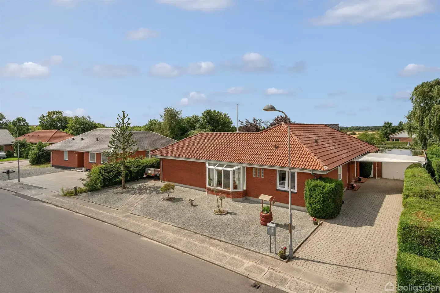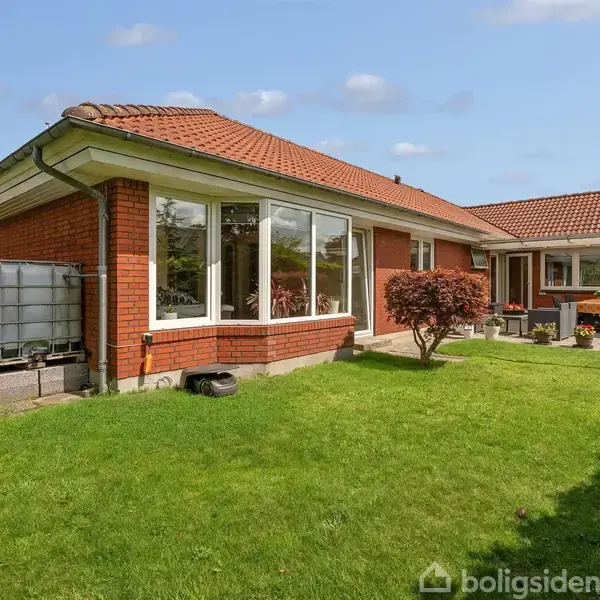 På en af de lukkede, trygge veje i Vardes Komponistkvarter ligger denne rødstensvilla fra 1970. Her får I 194 nydelige kvadratmeter, som udmærker sig ved at være yderst veldisponerede i gode afdelinger med flotte lysindfald. Udenfor venter en sydvestvendt have med solrig terrasse. Vinkelvillaen præsenterer sig klassisk med røde facader, rødt tag og hvide vinduesrammer samt en forhave anlagt med grus og stensatte bede som dekoration. Huset har nyere 3-lags vinduer overalt og du opnår derfor en god varmebesparelse. Indenfor fremstår boligen indbydende og harmonisk med lyse materialer og et flot dagslys, der strømmer ind gennem karnapper og vinduer. I den forbindelse må vi fremhæve soveværelset, som er et helt fantastisk rum med masser af plads, en fuld skabsvæg med spejle samt en karnap, der fylder hele den sydvendte væg. Karnappen giver en dejlig udsigt til haven - og der er ovenikøbet terrassedør, så man kan træde direkte ud i det grønne. Planløsningen passer perfekt til familielivet og er samtidig fleksibel, så I nemt kan tilpasse indretningen i takt med, at nye medlemmer kommer til - og senere igen, når fuglene flyver fra reden. De mange rum kan også bruges til liberal erhverv. Boligens hjerte er et køkken-alrum, der ligger som et åbent opholdsrum midt i huset og binder de øvrige afdelinger sammen. Først og fremmest fører en fransk dobbeltdør ind til stuen, som er et dejligt rum med parketgulv i fletmønster og vestvendte vinduer. Derudover giver alrummet adgang til to separate værelsesafdelinger: Den ene med to værelser og et toilet, den anden med tre værelser, spabadeværelse og bryggers. Der er således rig mulighed for både at indrette gode børneværelser og hobbyrum, kontor eller gæsteværelse. Terrassen er der også direkte adgang til fra køkken-alrummet. Den er stor, delvist overdækket og ligger godt i læ af husets vinkel - hvilket forlænger sommeren betragteligt. Derudover får I en god garage med tilhørende redskabsrum. Beliggenheden matcher resten af herlighederne. Der er kort cykelafstand til Frelloskolen, Børnehuset Lysningen og det store idrætscenter Sportium. Dertil kommer blot 500 meter til både Rema 1000, Lidl og Åboulevarden Station. En velindrettet, lys og fleksibel villa tæt på skole og grønne områder i Komponistkvarteret - lyder det som noget for jer? Tag kontakt til EDC Varde i dag, og hør mere.