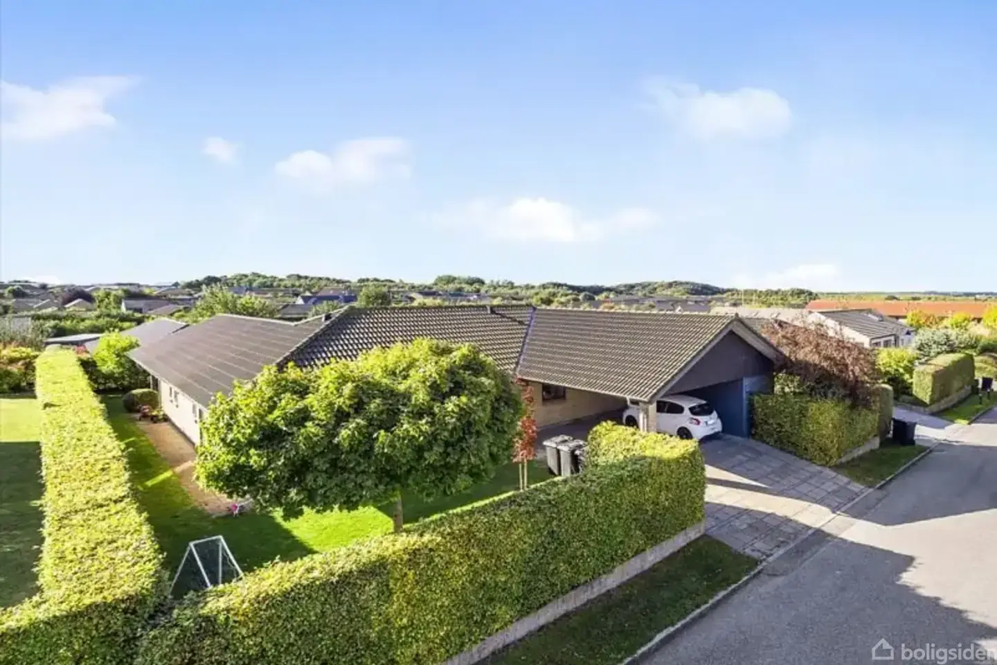 På en rolig, lukket vej i det populære Helenelyst finder I denne indbydende villa fra 2006. Huset kombinerer moderne arkitektur med en gennemtænkt planløsning og en beliggenhed, der gør hverdagen nem – tæt på både Børnehuset Safiren, Helenelyst Legeplads og områdets grønne fællesarealer. Huset er opført i lyse mursten og kendetegnes ved sit markante glasparti, der som en spids peger ud i haven og i retning mod Brabrand Sø. I spidsen er der en overdækket terrasse, som forlænger opholdsrummet i s