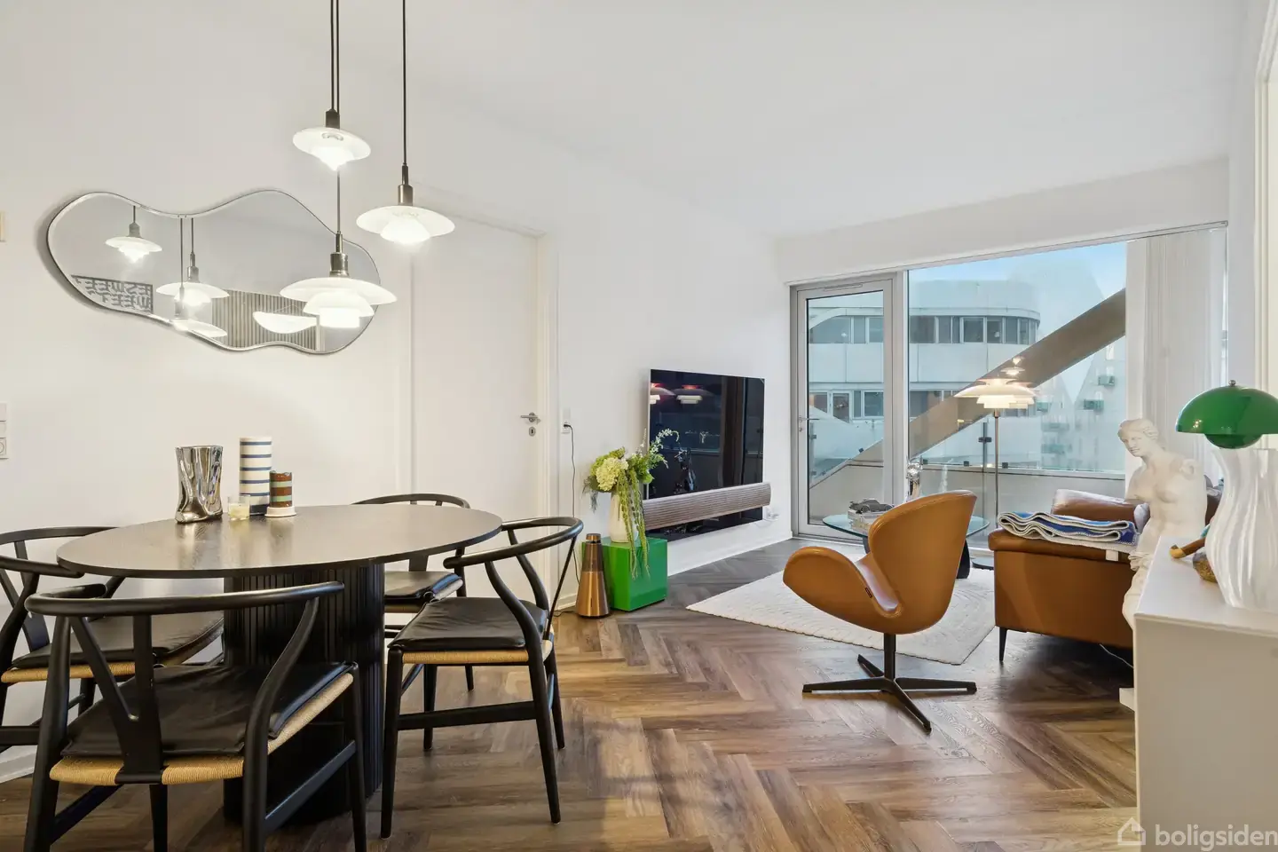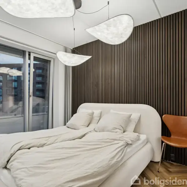 Stilren lejlighed med mørkt sildebensgulv, akustikpaneler og altan