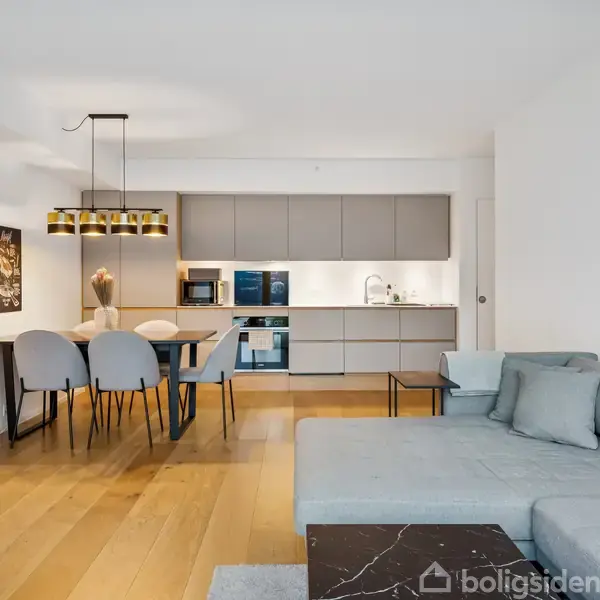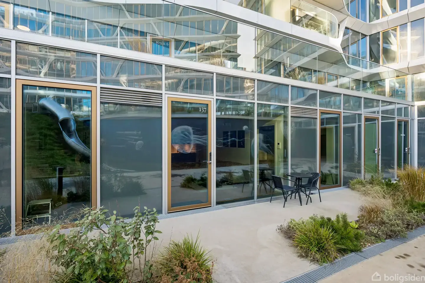 I Lighthouse får du en attraktiv placering ved Aarhus Bugt, med Aarhus midtby og Riis Skov lige i nærheden. Denne lejlighed har direkte indgang fra den store terrasse, som giver en naturlig forlængelse af opholdsrum og inviterer til udeliv fra morgen til aften. Du bliver mødt af en entré, der leder dig ind i lejlighedens flotte Designa-køkken med alle moderne hårde hvidevarer. Opholdsstuen er lys og indbydende med et stort gulv-til-loft vinduesparti, der giver udsigt til det hyggelige gårdmiljø