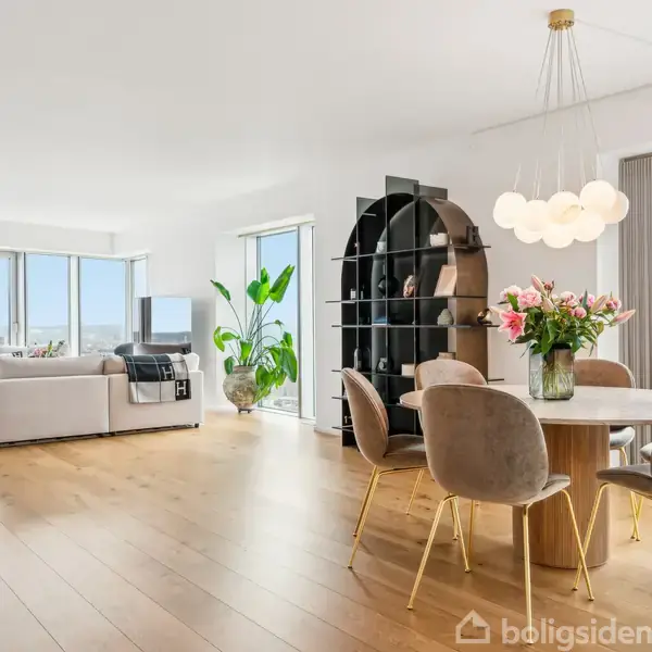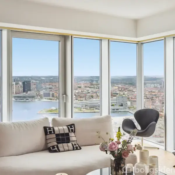 Denne unikke bolig byder på ekstraordinære faciliteter og optimal indretning. Her får du hele to altaner og to stilfulde badeværelser, som tilsammen skaber en sjælden og rummelig oplevelse. En lejlighed i denne størrelse og med denne beliggenhed i ejendommen er sjældent udbudt. Fantastisk lysindfald og udsigt over Aarhus Bugt Lejligheden åbner op med en entré, der leder dig videre til både værelsesafdelingen og lejlighedens "leverum" – et stort, åbent køkken-alrum og stue. Med imponerende gulv-