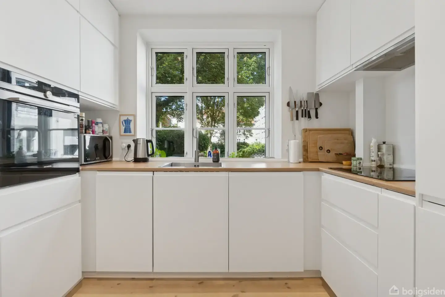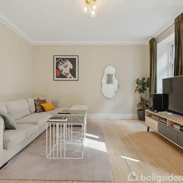 Velkommen indenfor i en bolig, hvor klassisk charme møder nutidige løsninger. Allerede i entréen fornemmer man den varme atmosfære – herfra åbner hjemmet sig og byder på en planløsning, der både er indbydende og funktionel. Det nyere køkken ligger lige ved indgangen, lyst og velindrettet med alt, hvad hverdagen kræver – herunder en opvaskemaskine, der gør oprydningen let. Badeværelset er også moderniseret og fremstår elegant med væghængt toilet og separat bruseniche. I boligens hjerte finder m