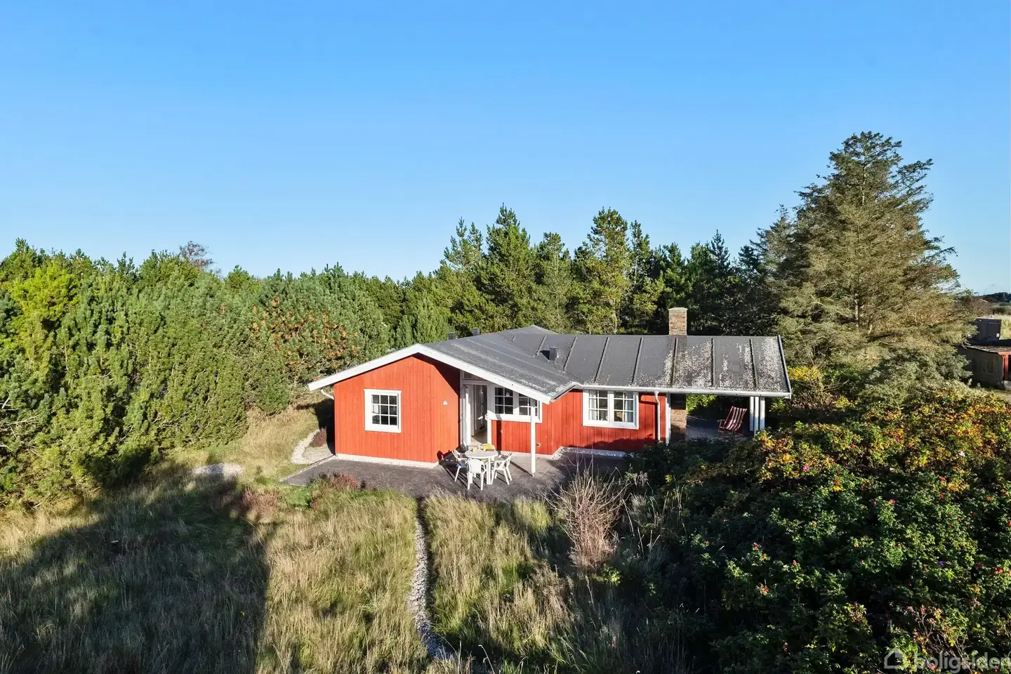Åbent hus med tilmeldingskrav 1/2 - klik på billede - Hvordan lyder det med lange, langsomme morgener, hvor I vågner i takt med solens rolige løft over horisonten? En morgendukkert inden kaffen og måske endnu én senere på dagen? Her i Lyngså bliver den drøm til virkelighed. Denne skønne sommerbolig syd for Sæby er nemlig et sted, hvor natur og stemning går op i en højere enhed og skaber de perfekte rammer om ferier og fridage. Det smukke, rødmalede fritidshus fra 2010 står knivskarpt og helt indflytningsklart. Med sort tagpap, hvide vinduer med sprosser og et charmerende udtryk passer huset perfekt ind i klitlandskabet omkring jer. Boligen rummer 68 m², og dertil kommer et integreret skur på 5 m², som er ideelt til opbevaring af havemøbler, strandudstyr eller værktøj. Indenfor mødes I af en lys og indbydende atmosfære. Opholdsrummet har loft til kip, hvilket giver en skøn rumfornemmelse, og her ligger det flotte, lyse køkken i åben forbindelse med stuen. Der er god plads til både spisebord og sofaarrangement, så her er rammerne på plads til både familiemiddage og langsomme feriedage med et spil kort eller en god bog. Brændeovnen skaber varme og hygge på kølige dage – og som en ekstra finesse fungerer den også som åben pejs på husets yderside. Det er ren sommerhusmagi. Planløsningen byder desuden på to gode værelser med skabe, et meget pænt badeværelse og en praktisk entré. Alt fremstår velholdt, gennemført og lige til at tage i brug. Huset har aldrig været udlejet, og både tilstands- og elrapporter er helt i top. Fra opholdsområdet er der udgang hele tre steder til den store træterrasse, der smyger sig rundt om hele huset. Her kan I følge solen fra morgenkaffen til aftenens sidste stråler, og når vejret driller, trækker I blot under den overdækkede del på hele 37 m². Huset ligger som en del af en lille gruppe på kun syv sommerhuse, godt tilbagetrukket for enden af en blind vej – helt ideelt for jer, der søger fred og privatliv. Klitlandskabet omkring jer er en oplevelse i sig selv, og ikke langt fra adressen finder I stierne mod Professorens Plantage. Her kan I samle blåbær, hyben eller krydderurter og tage naturens små gaver med hjem. Samtidig er Sæby kun en kort cykeltur væk. Her venter byliv, havnestemning, fiskerestauranter og gode indkøbsmuligheder. Grunden på 1.170 m² er en ægte naturgrund, der passer sig selv og glider smukt ind i det omkringliggende landskab. Her kan I slappe af, lade tankerne falde til ro og leve det liv, som sommerhusdrømme er gjort af. Kort sagt: Et gennemført lækkert, velbygget og charmerende fritidshus på en af de mest naturskønne adresser langs østkysten.