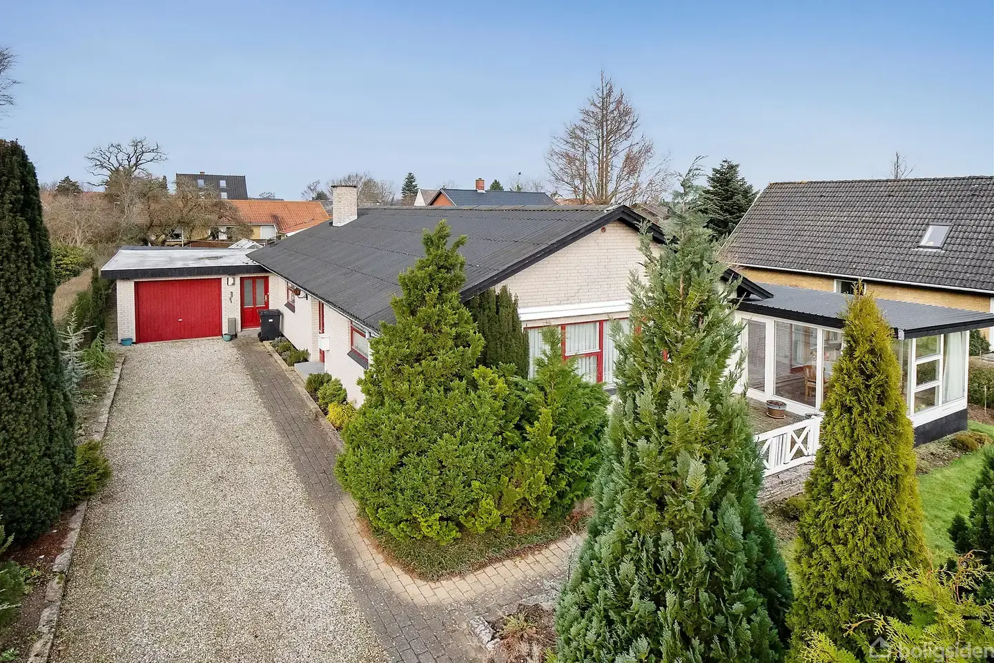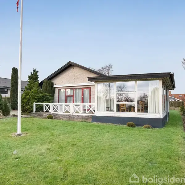 Et-plans villa med muret garage og udestue på rolig vej ved skole og købsmand.