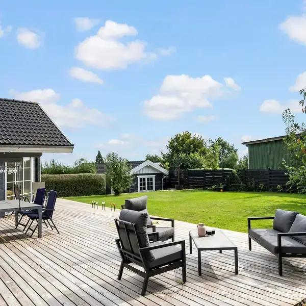 Bjælkehus fra 2008 på 157 m² i ét plan med gulvvarme og luft til vand varmepumpe - garage på 42 m² fra 2010