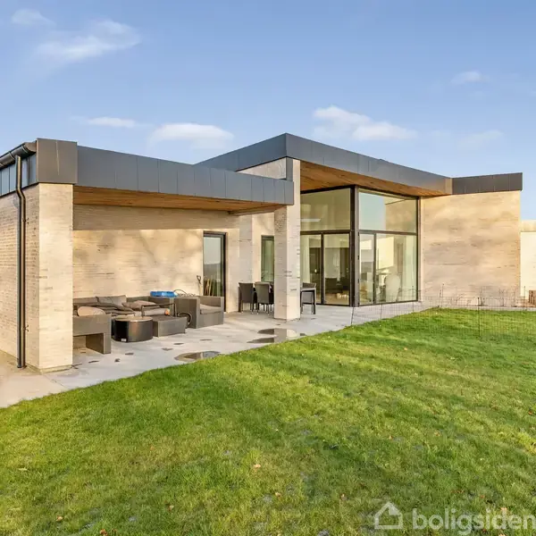 Velkommen til denne helt unikke arkitekttegnede villa, beliggende på en enestående grund med en betagende udsigt over natur og landskab – og med kig helt til Lillebæltsbroen.Udefra fremstår villaen elegant og moderne med smuk beige mursten, tagpap og sortrammede vinduer. Ankomsten sker via et indbydende indgangsparti samt en stor dobbeltport til garagen, som sætter tonen for boligens høje kvalitet.Indenfor mødes man straks af en fornemmelse af noget helt særligt. Det flotte sildebensgulv og den