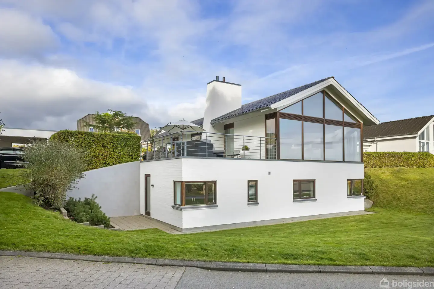 home har fornøjelsen af at udbyde en sjælden perle på Hjelmagervænget 39 i det attraktive Løgten. Her får du en kompromisløs og arkitekttegnet liebhavervilla hvor moderne luksus, gennemtænkt æstetik og naturskønne omgivelser går op i en højere enhed.Ejendommen troner smukt på grunden og åbner sig mod et betagende vue over det åbne marklandskab og Kalø Vig. Her forenes ro, udsigt og arkitektonisk raffinement i en bolig der både er skabt til hverdagsliv og til at imponere.Villaens 188 kvadratmeter