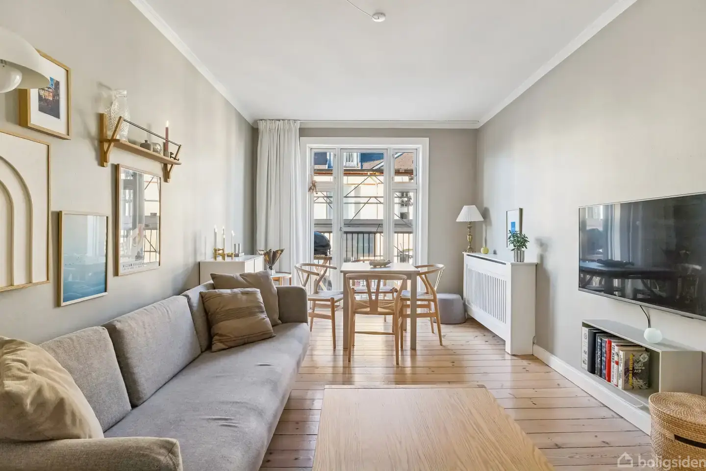 Indbydende og stilren 2-værelses lejlighed med solrig altan Netop nu står vi med nøglerne til en dejlig toværelses fra 1899 midt i Østerbros populære Århusgadekvarter. Her kan du overtage et klassisk københavnerhjem i fineste stand med hele Østerbro, det nye Nordhavn og resten af byen inden for rækkevidde. Indenfor rummer boligen 45 smagfuldt opdaterede og yderst veludnyttede kvadratmeter fordelt på to gode, reelle rum – en stue og et værelse – samt et lækkert køkken, et toilet med separat brus