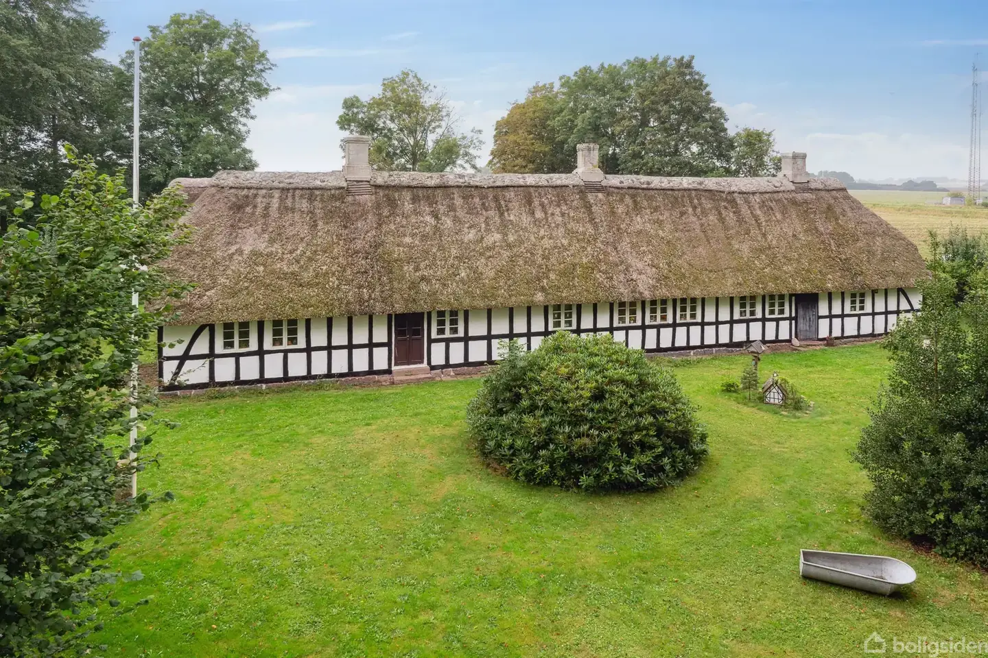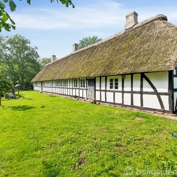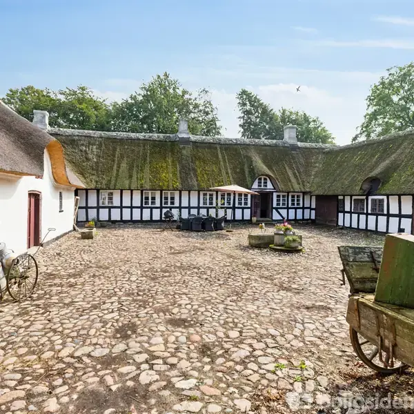 · Historisk og prisbelønnet ejendom · Restaureret siden 2015 i samarbejde med restaureringsarkitekt · Charmerende og funktionel bolig – med moderne komfort i form af hhv. gulvvarme og varmepumpe · Mange udbygninger og anvendelsesmuligheder · Naturskøn og bekvem beliggenhed - hele 15.000 m2 grund Akkurat uden for Søndersø ligger denne smukke, firelængede ejendom fra 1860, tidligere anvendt som fæstegård. Den stråtækte bindingsværksejendom fremstår med et velbevaret, oprindeligt udtryk og er omgivet af åbent landskab. Siden 2015 er ejendommen nænsomt restaureret med respekt for bygningernes alder og materialer, og senest er der foretaget forbedringer i perioden 2022–2024. Ejendommen omfatter stuehus, tre disponible længer, en fritstående lade og en naturskøn grund på cirka 1,5 hektar. Den pigstensbelagte gårdsplads byder velkommen og indrammes af hvidkalkede tavl, sortmalet tømmer og klassiske sprossevinduer. De nyere stråtage fra henholdsvis 2012, 2022 og 2024 fuldender helhedsindtrykket. Stuehuset rummer 183 kvadratmeter (jf. BBR), primært i stueplan, med gulvvarme i størstedelen af boligen. Derudover er der kælder og førstesal med toilet og bad. Indenfor opleves en særlig stemning med originale detaljer, synlige loftsbjælker og solide gulve i blandt andet fyrretræ, tegl og skifer.Køkkenet med støbejernskomfur og fadebur ligger centralt i huset og har forbindelse til tre sammenhængende stuer samt to værelser, heraf ét med alkove. I den modsatte fløj findes yderligere to værelser, badeværelse og bryggers. Opvarmningen sker via luft-til-vand varmepumpe suppleret af brændeovne. Udbygningerne giver mange anvendelsesmuligheder med blandt andet butikslokale, lader, stald med fire hestebokse, værksted, garage og disponible rum. Haven er frodig og stemningsfuld med frugttræer, bærbuske og flere opholdssteder, mens de omkringliggende marker og gamle træer skaber ro og naturnærhed. Beliggenheden kombinerer det landlige med kort afstand til Søndersø, hvor indkøb, skole og fritidstilbud findes, og Odense nås på cirka 15 minutter i bil. Klik her - følg EDC Søndersø på Facebook og få indblik i det nordfynske boligmarked, konkurrencer og meget mere!