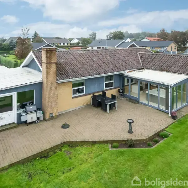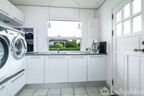 Her får du en rigtig fin villa i et plan og med rigtig god planløsning.Boligen består af dejligt lyst bryggers med god skabsplads og hævet plads til vaskemaskine og tørretumbler. Fra bryggers kommer du til køkkenet med hvide fyldnings låger (2008) og herfra til kombineret alrum og spisestue. I åben forbindelse hermed har du dejlig lys stue med stort vinduesparti mod udestuen og haven. Sælger bruger udestuen til stort udendørs spabad - dette kan evt. købes med til huset. Fra spisestuen kommer man