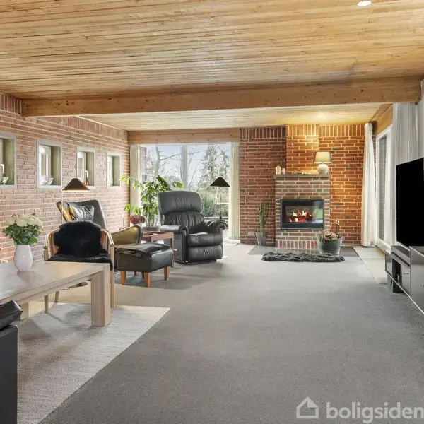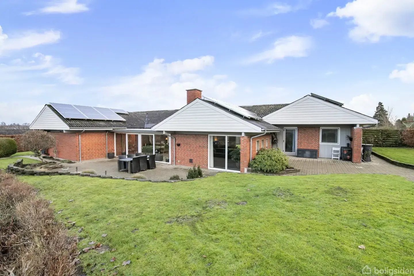 På Højmarken 10 får I en sjældent udbudt kombination af fuldmuret kvalitet, arkitektonisk karakter og en placering, der hører til blandt de absolut bedste i Terndrup. Den store etplansvilla rummer 264 m², suppleret af en 62 m² garage, og ligger for enden af en lukket stikvej – helt privat, fredeligt og med naturen som nærmeste nabo. Herfra har I en panoramaudsigt over det kuperede landskab, hvor skoven, markerne og de smukke solnedgange skaber en stemning, man ikke finder mange steder i byen.Stu