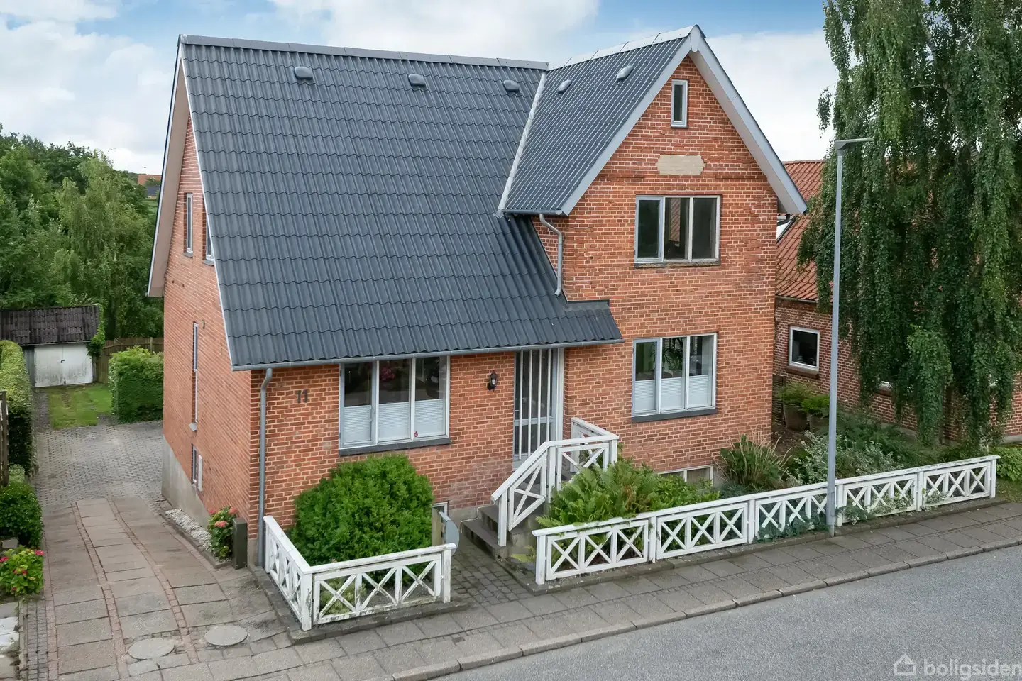 Høngårdsvej 11 er en klassisk og gedigen rødstensvilla med nyt stort eternit B7 tag, beliggende i et fredeligt kvarter tæt på både byens faciliteter og den omkringliggende natur. Her får du en rummelig bolig i tre plan, ideel til familier eller dem, der ønsker masser af plads, ro og mulighed for selv at sætte sit præg.Selve boligen er i tre plan. Kælder med integreret garage med port og med direkte adgang til et dejligt lyst bryggers med hvidt arrangement med vask og plads til vaskemaskine under
