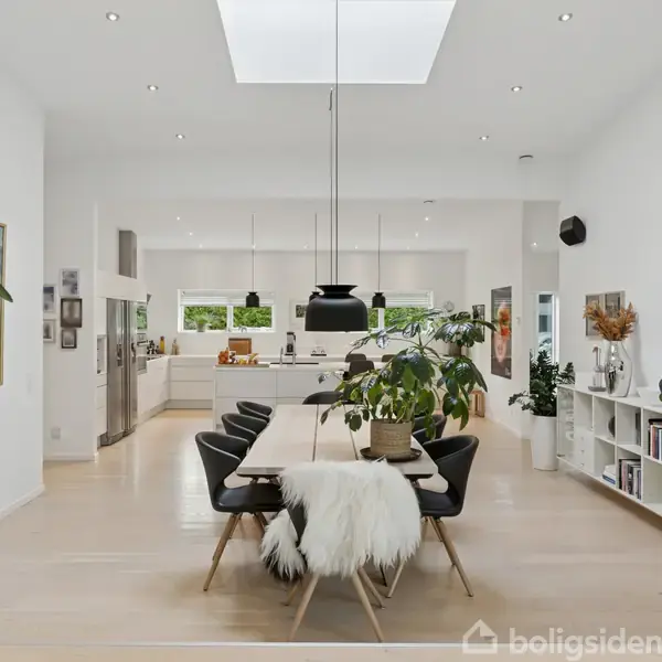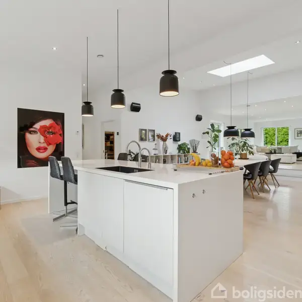 Mellem Nordsjællands smukke natur og det levende lokalmiljø i Allerød ligger denne sjældent udbudte, arkitekttegnede villa fra 2014. Her får I en moderne og gennemtænkt bolig på hele 288 m², placeret på en stor grund på 1.246 m² – ideel til familielivet med god plads, høj komfort og smuk arkitektur.Det står hurtigt klart, at der er tale om en bolig ud over det sædvanlige. De store vinduespartier, den stilrene farvepalet og de høje lofter skaber et lyst og rummeligt hjem, hvor arkitekturen virkel