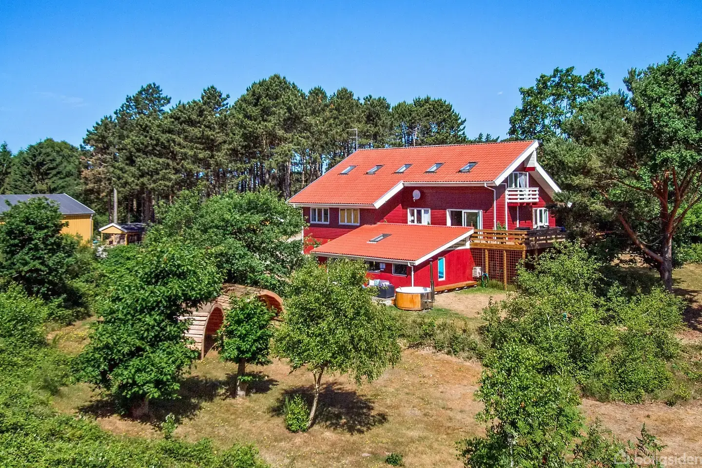 Skønt beliggende i et fredeligt sommerhusområde tæt på Ebeltofts hyggelige by. Ligger dette rummelige og charmerende poolhus med plads til hele 28 personer. Her ligger huset perfekt, direkte op til Ebeltoft Golfklubs naturskønne baner, og omgivet af masser af muligheder for både afslapning og aktivitet. På den 2600 m² store naturgrund venter der oplevelser for alle. Her er to store shelters og et brændefyret vildmarksbad med plads til otte personer. I huset kan I fortsætte hyggen – aktivitetsr