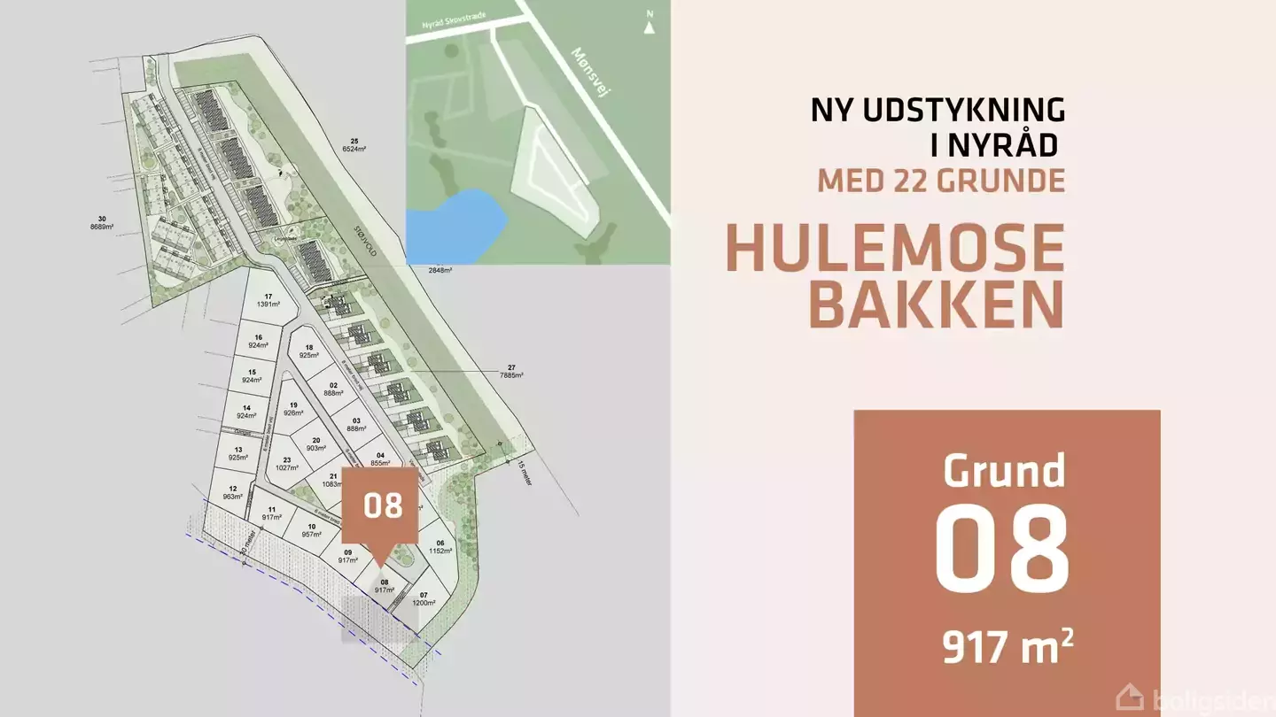 Hulemosebakken – ny udstykning i Nyråd. For virksomheden Valu Ejendomme ApS udbydes nu et areal på ca. 95.000 kvadratmeter, fordelt med 22 byggegrunde og 66 udlejningsboliger. Første etape i udstykningen bliver de 22 byggegrunde, hvoraf de 8 grunde allerede er solgt. Området bliver uden nogen form for gennemkørsel, idet der er tale om en lukket udstykning, som det perfekte sted for børnefamilier, med hastighedsbegrænsning på 15 kilometer i timen, med hensynet til børn og hvor der bliver etableret stiforbindelse til 2 af de tilstødende villaveje i de tilstødende udbyggede udstykninger Fladbækvej og Søbakken, hvorfra der er videre stiforbindelse ned til Hulemose-søen - der er også har sti rundt om hele søen – der er bygget broer og platforme ude i søen - hvor naturen kan indåndes i fulde drag og som støder op til den nye udstykning på Hulemosebakken. Fra udstykningen er der også stisystemer rundt i Nyråd, med tunneladgange under både Fladbækvej og Kalvehavevej, så det er muligt at såvel gå som cykle til bl.a. skolen, stranden, rideskolen og hele vejen ind til Vordingborg by, via den lokale ”Bakkebølle-stien”. Selve området eller udstykningen Hulemosebakken ligger i udkanten af Nyråd og som – på den ene side ligger direkte op til beskyttet mose, hvor Fladbækken løber og trækker Bækørreder og Gydegeder til. På den anden side af Mønsvej – mod nord - er der etableret et 15 hektar stort offentligt naturområde. Få minutter herfra ligger Sydmotorvejen- vi er ca. halvvejs mellem København og Rødby- og i Vordingborg by ligger stationen med timedrift til og fra København. Bussen med hyppig drift imellem Stege og Vordingborg har stoppested lige ud for udstykningen og adskillige andre steder i Nyråd. På den anden side af Kalvehavevej - ned mod vandet og forbundet af et veludbygget stisystem - ligger Vintersbølleskovens 120 hektar, som tilhører Det Petersgårdske Skovdistrikt. Her ligger Valdemarstenen ved en af de 7 stendysser - og sagnet fortæller, at fordybningen i stenen er lavet af hovedet på Kong Valdemar Atterdags hest under hans vilde ridt gennem skoven, og at stregen langs stenens kant er slået af hans pisk. Nyråd ligger med sit landsbyagtige præg små 3 km. fra Vordingborg, men byder på det meste af, hvad man har brug for i hverdagen. Der er bager, Dagli'Brugs med de nødvendige dagligvarer, godt beliggende skole med klassetrin op til 6 kl., sportshal, boldbaner og ikke mindst den skønne natur med vandet i form af Storstrømmen indenfor kun 15 minutters gåtur - og med Hulemosesøen, som med sin forekomst af gedder, karper etc. er et pragtfuldt sted for lystfiskeren, men også byder på en malerisk spadseretur rundt om søen. Hvis man ikke lige er lokal og tænker, hvor langt er der egentlig til København, kan vi oplyse, at tiden til Sjællandsbroen ikke er mere end ca. 59 minutter. Grundene sælges byggemodnet med vand- og kloakstik til spildevandet, indlagt til grunden og tilslutningsafgift betalt. Overfladevandet/regnvandet skal føres til faskine på egen grund, som også skal afholdes af køber. Herudover bliver der forberedt til el og fiber, i form af trækrør, men selve tilslutningsafgiften skal afholdes af køber. Selve udstykningen til byggegrundene forventes færdig med veje, stier, grønne arealer m.m. til september 2025. Sælger oplyser også, at det er dennes hensigt at etablere legeplads i området, når alle boliger – inklusiv lejeboligerne er bygget færdig. Der foreligger geoteknisk rapport for hver enkelt byggegrund, som kan rekvireres hos mægler. Der er ikke byggepligt på grundene. Det er ikke muligt at få fjernvarme i udstykningen. I forhold til selve bebyggelse af grundene, er der jfr. lokalplanen en bebyggelsesprocent på 30, boligerne må bygge op til 1½ plan (altså ikke funkis) og derudover op til 50 kvadratmeter sekundære bygninger. Her bliver etableret støjvold ud mod Mønsvej i en forventet højde på ca. 5-6 meter og i øvrigt henvises til lokalplanen.