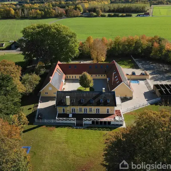 I den nordøstlige del af Ringsted kommune, nærmere bestemt Vigersted som er kendt som Ringsted kommunes " Bjerglandsby ", ligger denne fantastiske firelængede gård. Her der gangafstand til de store skovområder under "Humleore skovdistrikt”, med fint forgrenet stisystem. varieret dyreliv og nem adgang til "Oplevelsesstien” som bringer jer videre ud i naturen på det skønne Midtsjælland. "Bjergagergaard" er omkranset af hele 40.000 kvm grund (4 ha.), udlagt som folde og omkranset af fint hvidt hegn. I tilknytning til foldene er der løsdriftsstalde med frostfri vanding, fine befæstede arealer. Elektrisk port anlæg fører ind til ejendommen, og herfra er der via åben port adgang til gårdspladsen, som igen har adgang til alle gårdens længer. Den markante 2 plans bolig er på hele 374 kvm. fordelt mi 2 plan, funktionel indretning med vestvendt udgang fra både køkken og stuer til den overdådige store terrasse, hvor sommerens grillaftener kan nydes. Mange fine detaljer med naturskiffertag, kobbertagrender og meget mere. Den store have rummer tillige en paddelbane, fin overdækning til haveredskaber, generator og et solcelleanlæg på hele 45 KW. Udbygningerne er et sandt eldorado for jeres firma eller som showrum m.v. Her er et væld af spændende kontorer, personalerum, hjemmebiograf, fitnesscenter, garager, edb. rum, vin-rum gæsteværelser, varmecentral med både brændefyr og træpillefyr. Så kan I altid benytte den energikilde som er billigst. Fint rødt betontegltag står godt til den gule farve på udlængerne. De 3 sammenhængende udlænger har et grundareal på 730 kvm. og alle 1. sale er i brug så der er ca. 1200 kvm. som kan opvarmes og bruges til alle jeres aktiviteter, erhverv m.v. Kun fantasien sætter grænser for udnyttelsen.