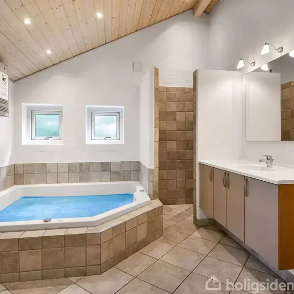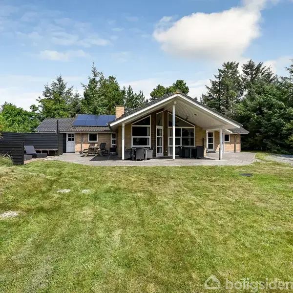 Dette store fritidshus ligger midt i det populære område kendt som "Den Gyldne Trekant" – et af Blåvands mest eftertragtede steder. Her får du det bedste af begge verdener: kun få minutters gang til både det livlige byliv og den skønne strand. En helt unik placering, perfekt til jer, der vil have det hele inden for rækkevidde.Huset er opført i ét plan og rummer 146 m², med lofter til kip. Indretningen består af fem soveværelser, alle udstyret med dobbeltsenge og god skabsplads. Derudover er der