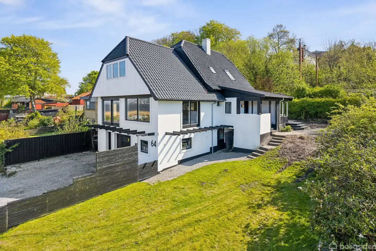 Ibæk Strandvej 64 er en charmerende villa fra 1927 med en unik beliggenhed ved Vejle Fjord. Ejendommen rummer 187 m² fordelt på tre plan og ligger på en 835 m² grund med udsigt, lys og luft som faste følgesvende. Villaen blev ombygget i 1987 og står i dag med vandskuret facade og sorte tagsten. Stueplanen byder på vindfang, hall med smuk trappe, lyst gæstebadeværelse samt køkken med udgang til terrasse og åben forbindelse til alrum og spisestue med brændeovn. Herfra træder man ind i opholdsstuen, hvor fjordudsigten skaber en helt særlig atmosfære. På førstesalen findes repos med plankegulv, kontor, stort værelse, badeværelse fra 2024 samt soveværelse med walk-in closet. Kælderen rummer bryggers og et disponibelt rum med udgang til haven, der primært er anlagt med græs og terrasser til både sol og samvær. Beliggenheden kombinerer naturskønne omgivelser med nærhed til både Vejle centrum og de omkringliggende skove.