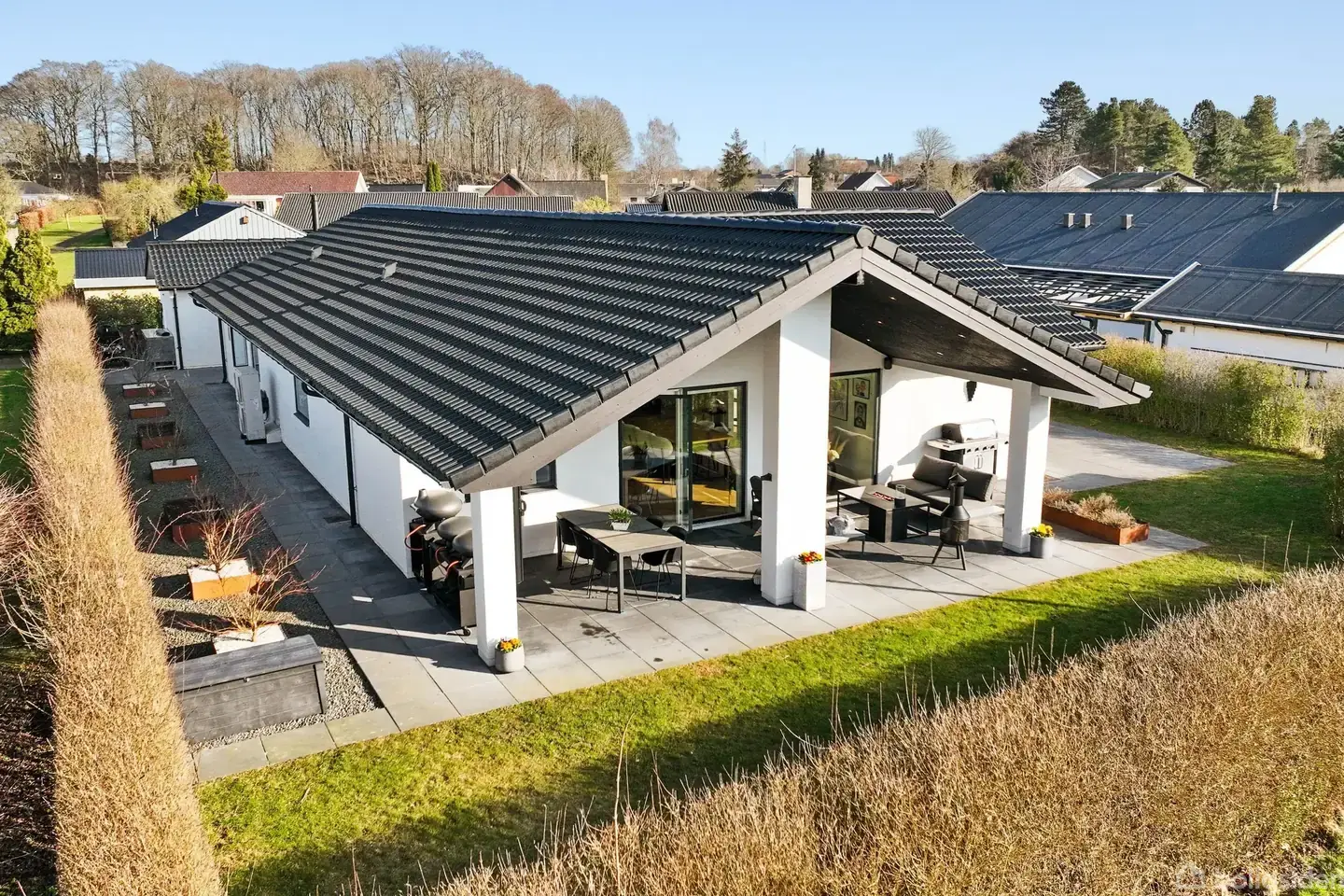 Navnet Iris passer perfekt – lige så betagende som den græske gudinde. På Irisvænget får du en bolig med raffinement, lys og gennemført kvalitet. Renoveret fra A-Z, hvor materialer og detaljer er nøje udvalgt, og alt står som nyt til et liv i luksus og velvære. Huset omkranses af et gennemtænkt terrassemiljø med fliser hele vejen rundt og flere solrige kroge. Den overdækkede terrasse med loft til kip og indbyggede spots skaber et stemningsfuldt frirum, hvor loungemøbler, liggestole og grill kan nydes med udsigt til skov og åbne vidder. Garagen matcher husets arkitektur og fuldender den gennemførte stil. Her leves livet i rolige omgivelser, hvor naturens farvespil følger årstiderne, og stisystemerne inviterer til gåture mellem mose og skov. Skole, indkøb og Køge Torv ligger tæt på, og Køge Nord Station giver kun 11 minutter til København. Indvendigt byder boligen på eksklusive detaljer og massive sildebensgulve fra Junckers i eg, der tilfører varme og karakter. Forældresoveværelset er en privat suite med walk-through-closet og luksuriøst badeværelse med dobbelte rainshowers. Hertil kommer endnu et badeværelse og tre værelser, hvoraf ét er indrettet som åbent arbejdsværelse med udgang til haven – let at omdanne til ekstra værelse. Køkken og spiseafdeling ligger i ét stort, åbent rum med Designa-samtalekøkken i sort og hvid, køkkenø og Gaggenau-hvidevarer. Store vinduespartier lader dagslys fylde rummet og åbner mod haven. Stuen fuldender oplevelsen med panorama og sansevindue til fordybelse. Varmepumpe og blødgøringsanlæg sikrer moderne komfort, mens huset kombinerer æstetik, funktion og velvære. Dette er mere end en bolig – det er en mavefornemmelse, du mærker fra første øjeblik.
